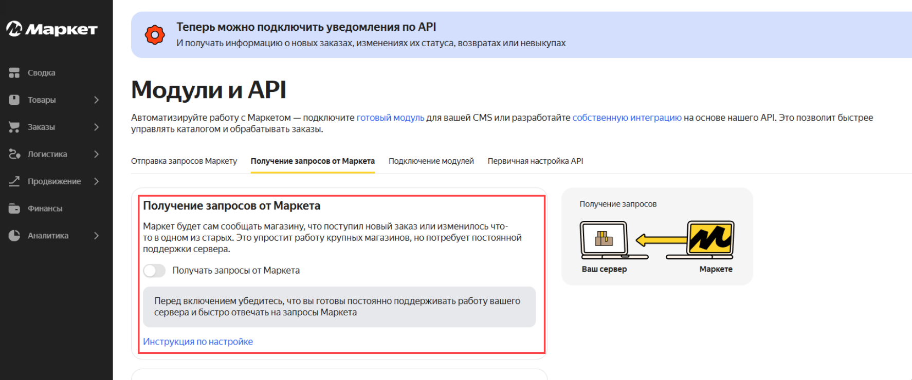 При включении обмена с личным кабинетом, обязательно должен быть включен обмен заказами, если в Личном кабинете Яндекс Маркета уже настроена работа через API.
