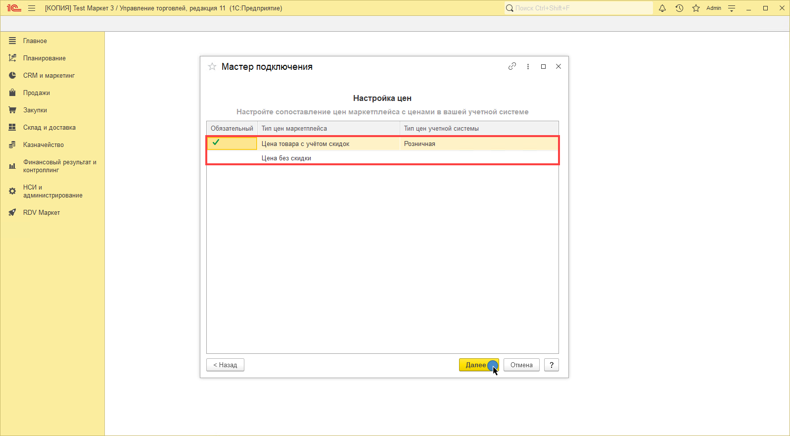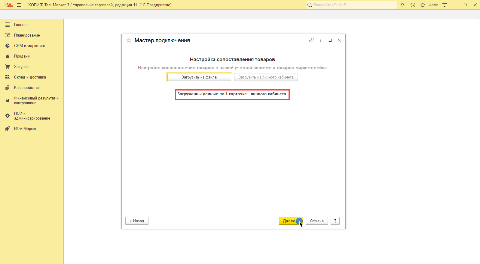 После выполнения сопоставления необходимо нажать на кнопку "Далее":