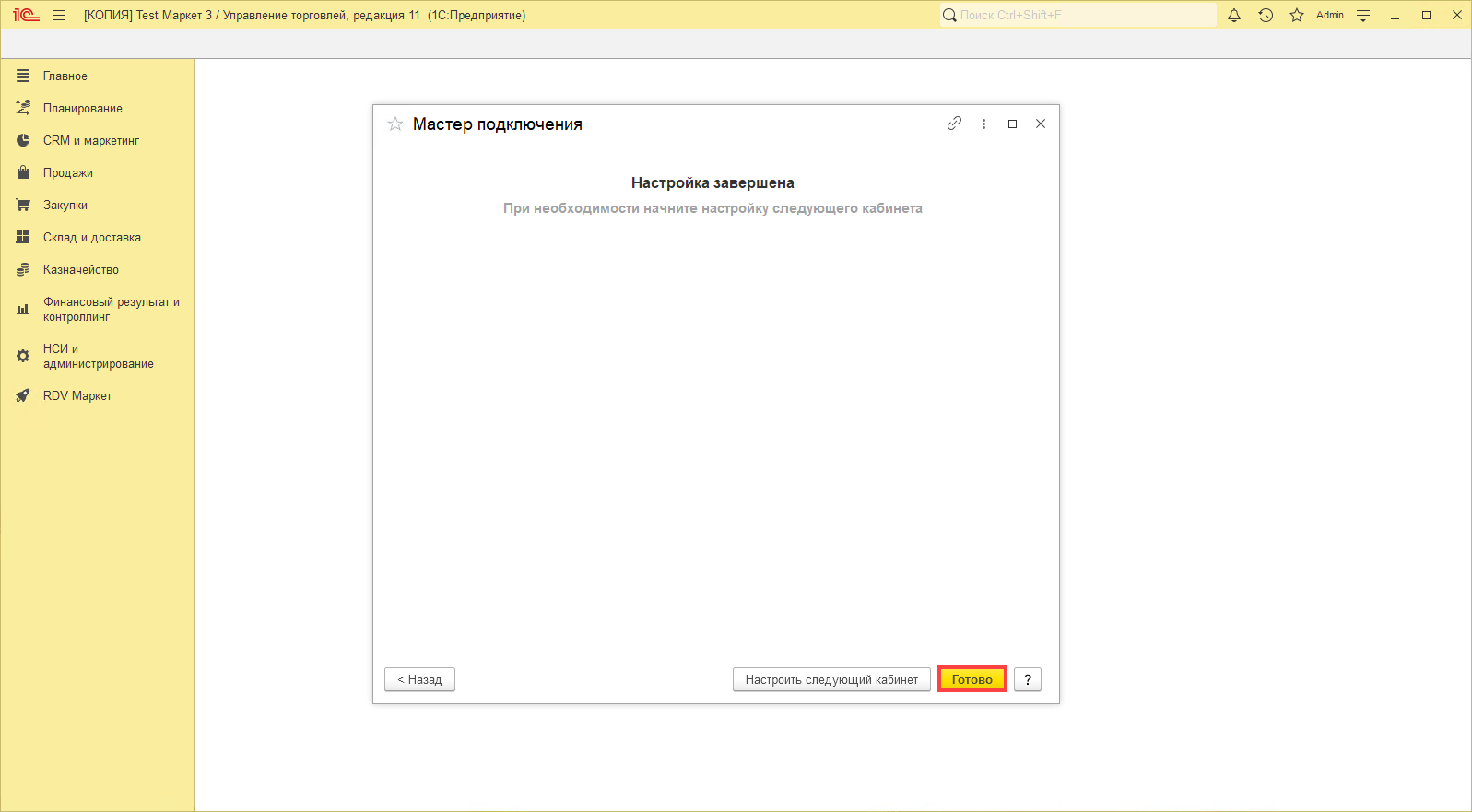 Можно начать настройку следующего кабинета или выйти из мастера подключения по кнопке "Готово":