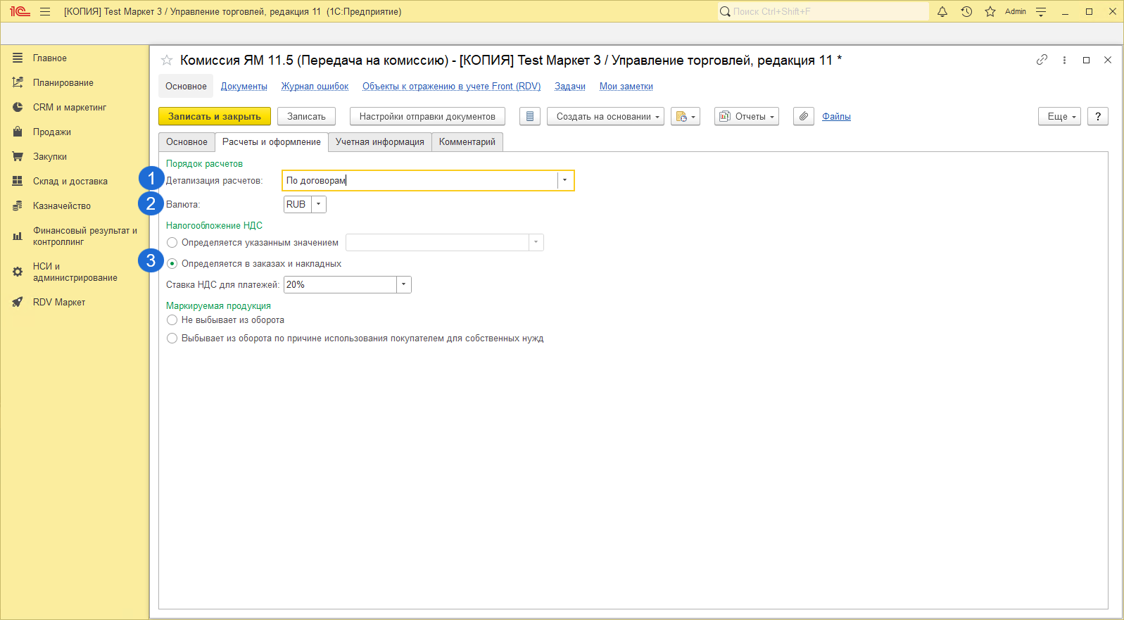 Если используется синхронизация с 1С БП, требуется выполнять настройку по схеме комиссионной продажи 11.0 / 2.0. Подробнее об отличиях комиссионных схем.