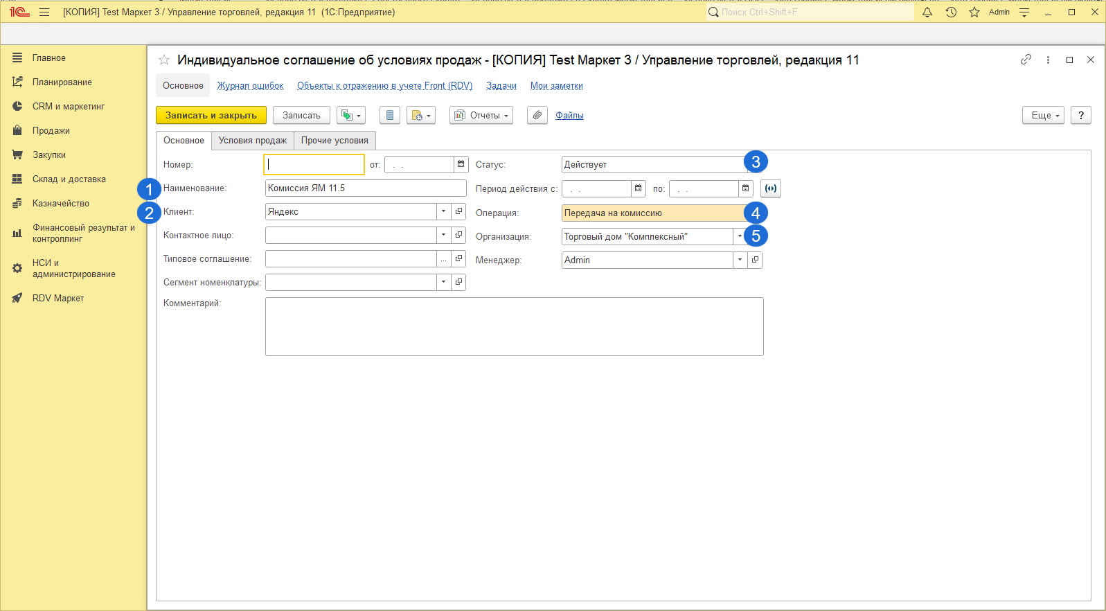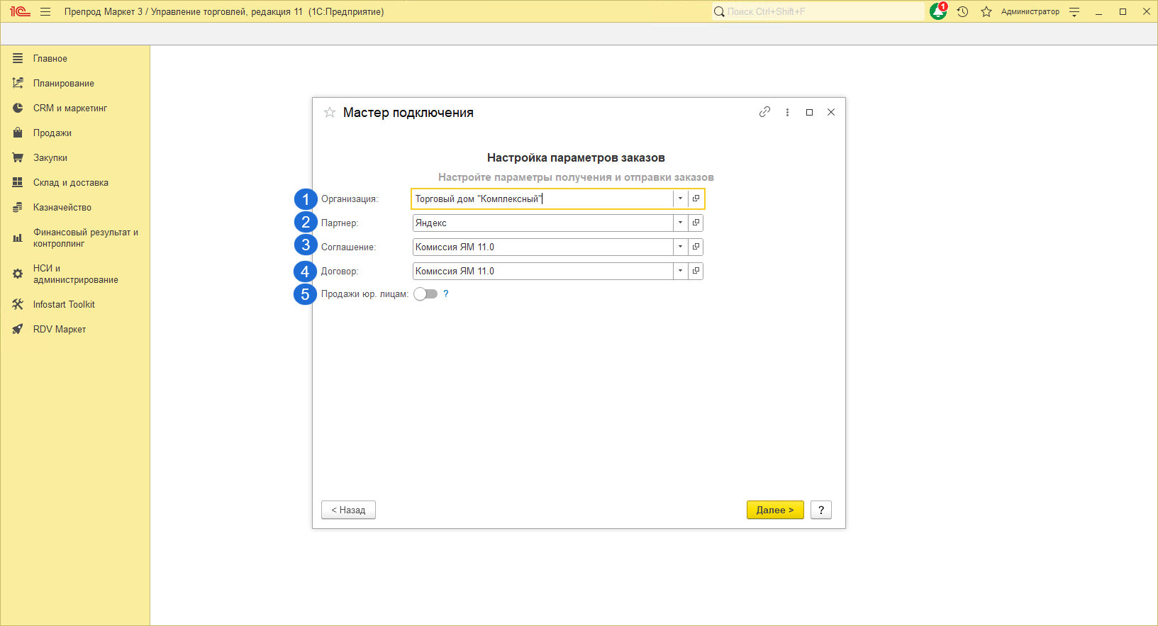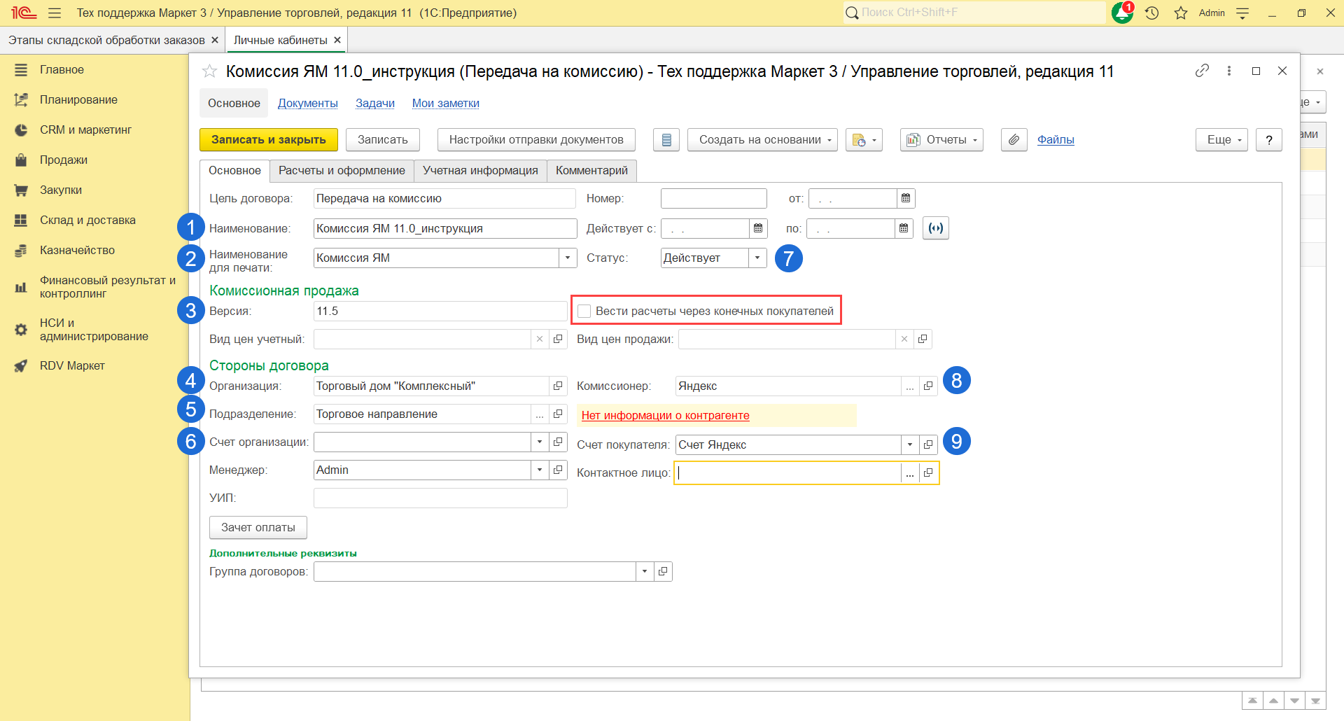 - Если в базе включена настройка "Использование соглашений с клиентам", то необходимо указать соглашение для контрагента Яндекс Маркет.
