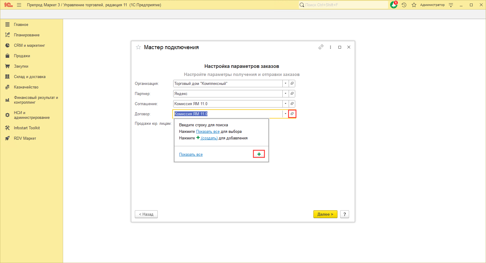 - В данном поле необходимо указать договор с Яндекс Маркетом. В базе обязательно должна быть включена настройка "Использовать договоры контрагентов".