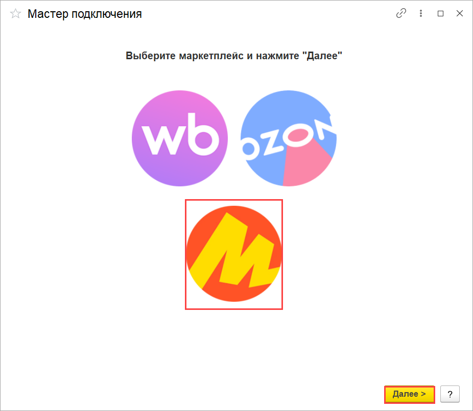 Если в базе 1С включена настройка "Использовать договоры с клиентами", то открывается окно с выбором маркетплейса, для которого будет настраиваться подключение.