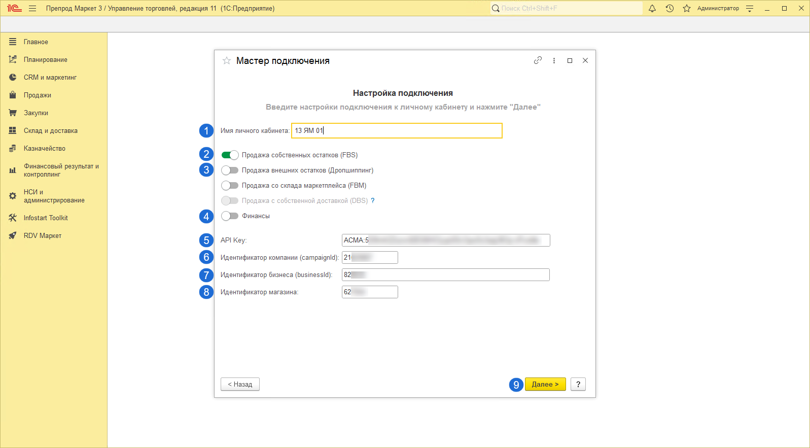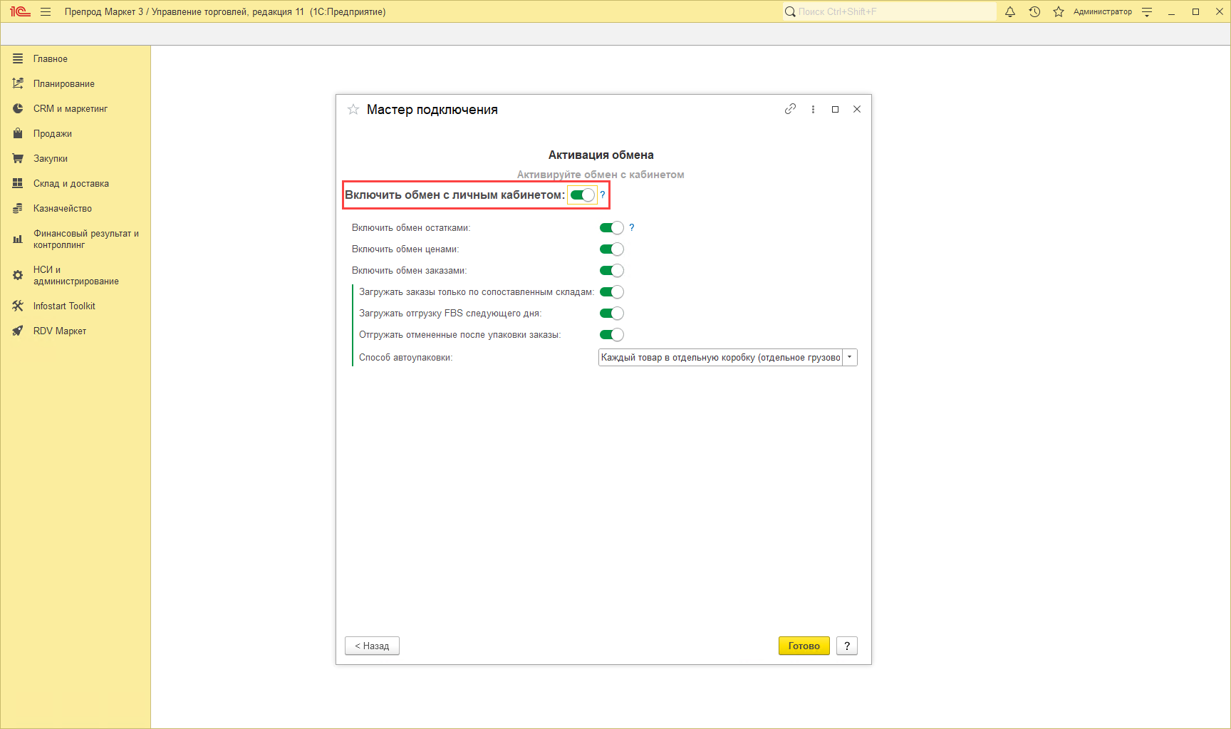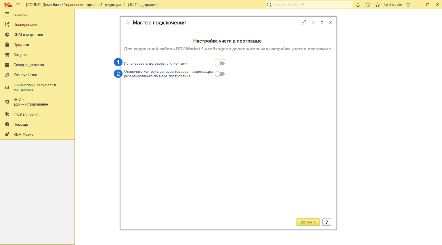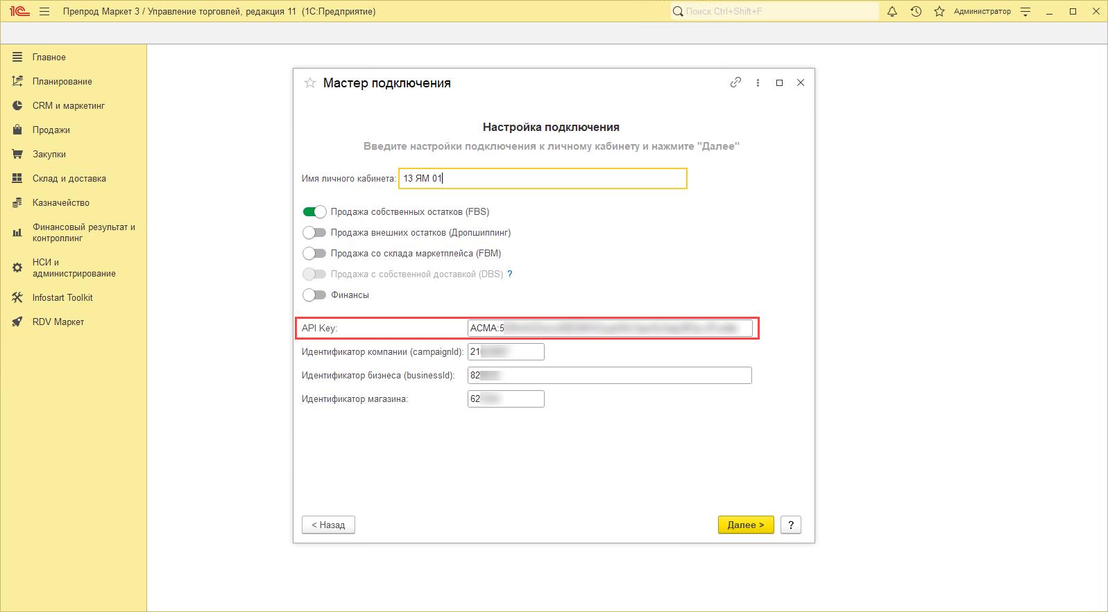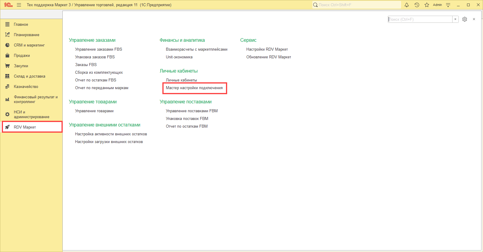 Для настройки личного кабинета необходимо перейти в раздел "RDV Маркет" - "Мастер настройки подключения".