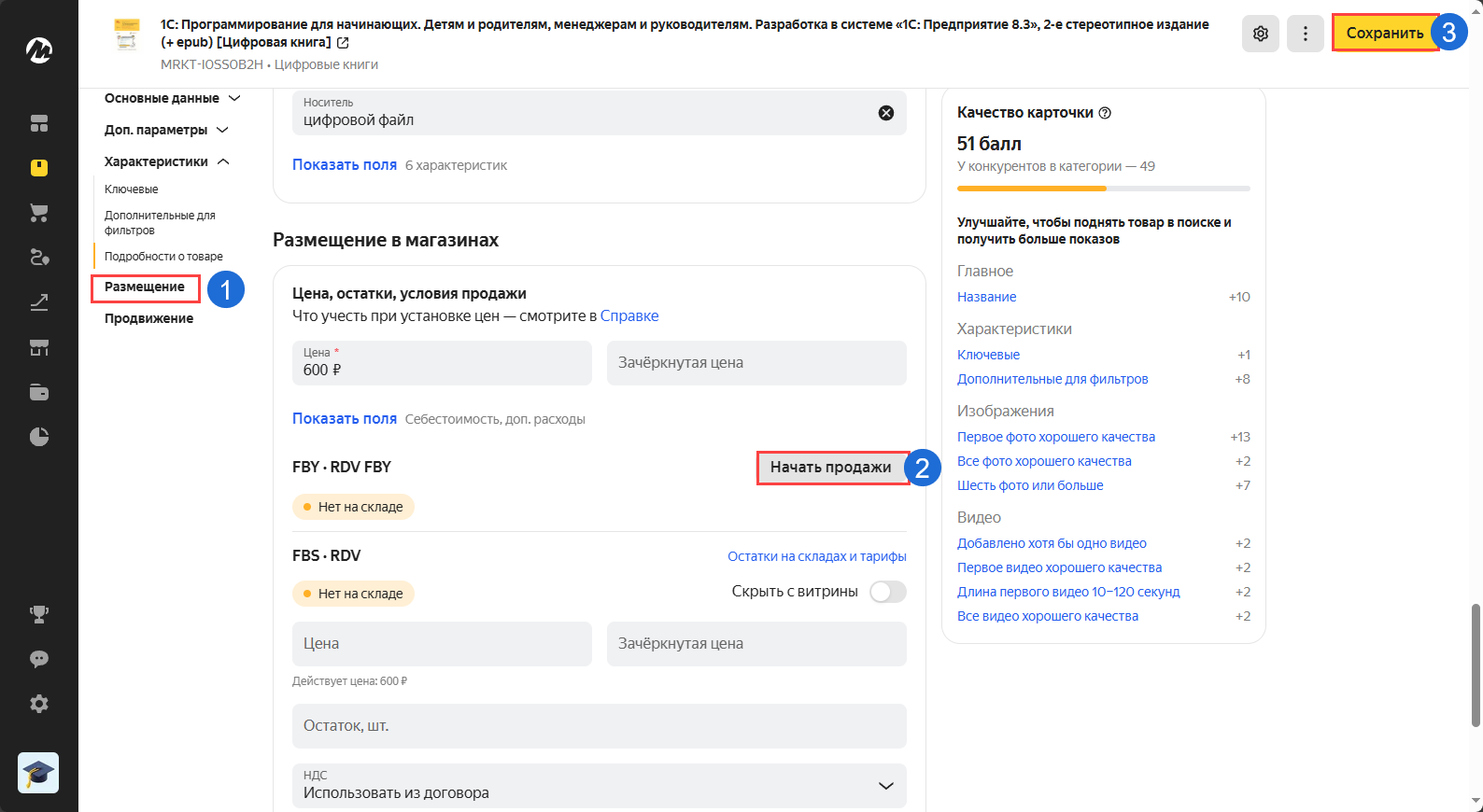 Чтобы получить новые созданные карточки, которые еще не продавались, необходимо зайти в карточку в раздел "Размещение"(1) нажать "Начать продажу"(2) и "Сохранить" (3):