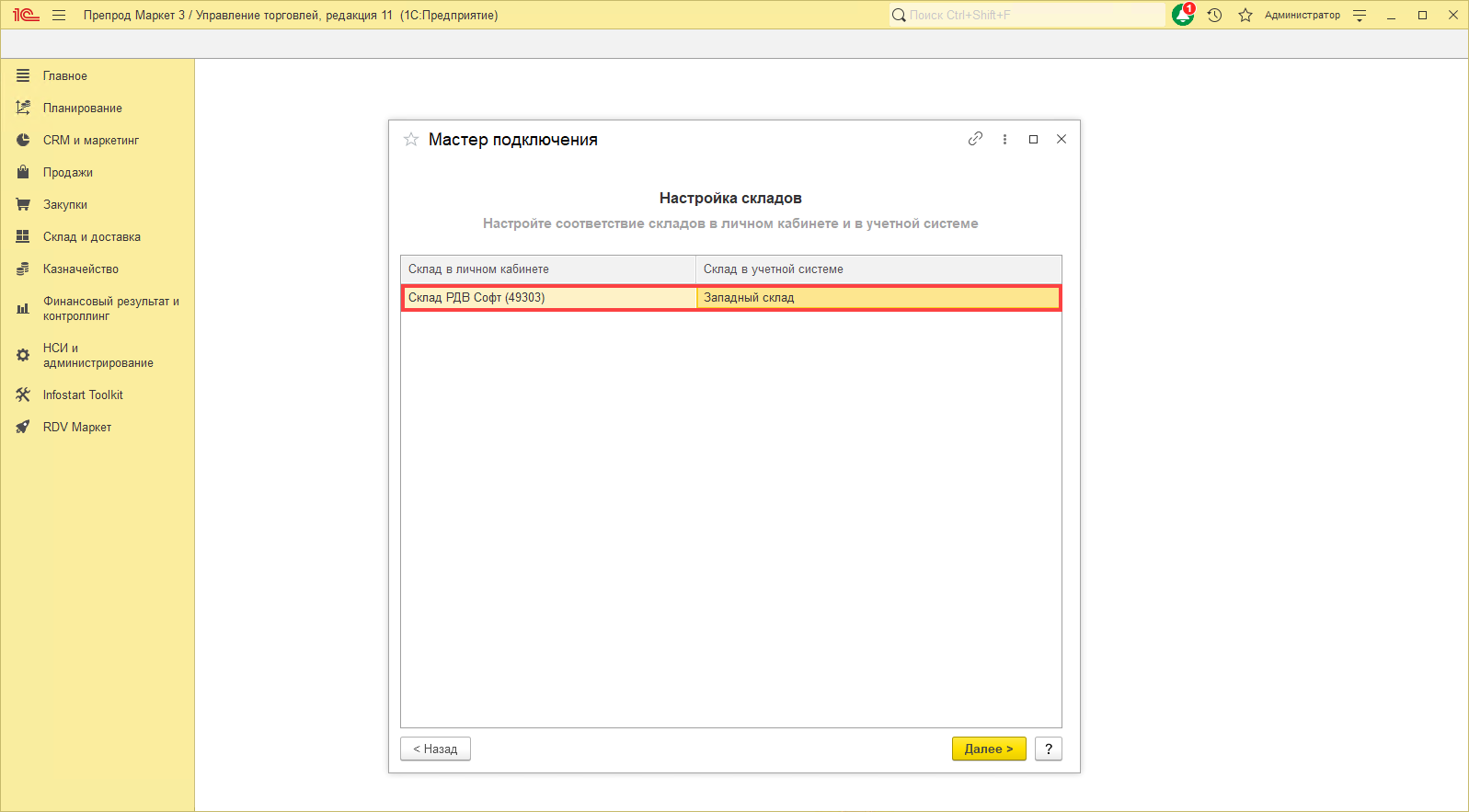 На данном шаге необходимо выполнить сопоставление склада из Личного кабинета и склада в учетной системе 1С.