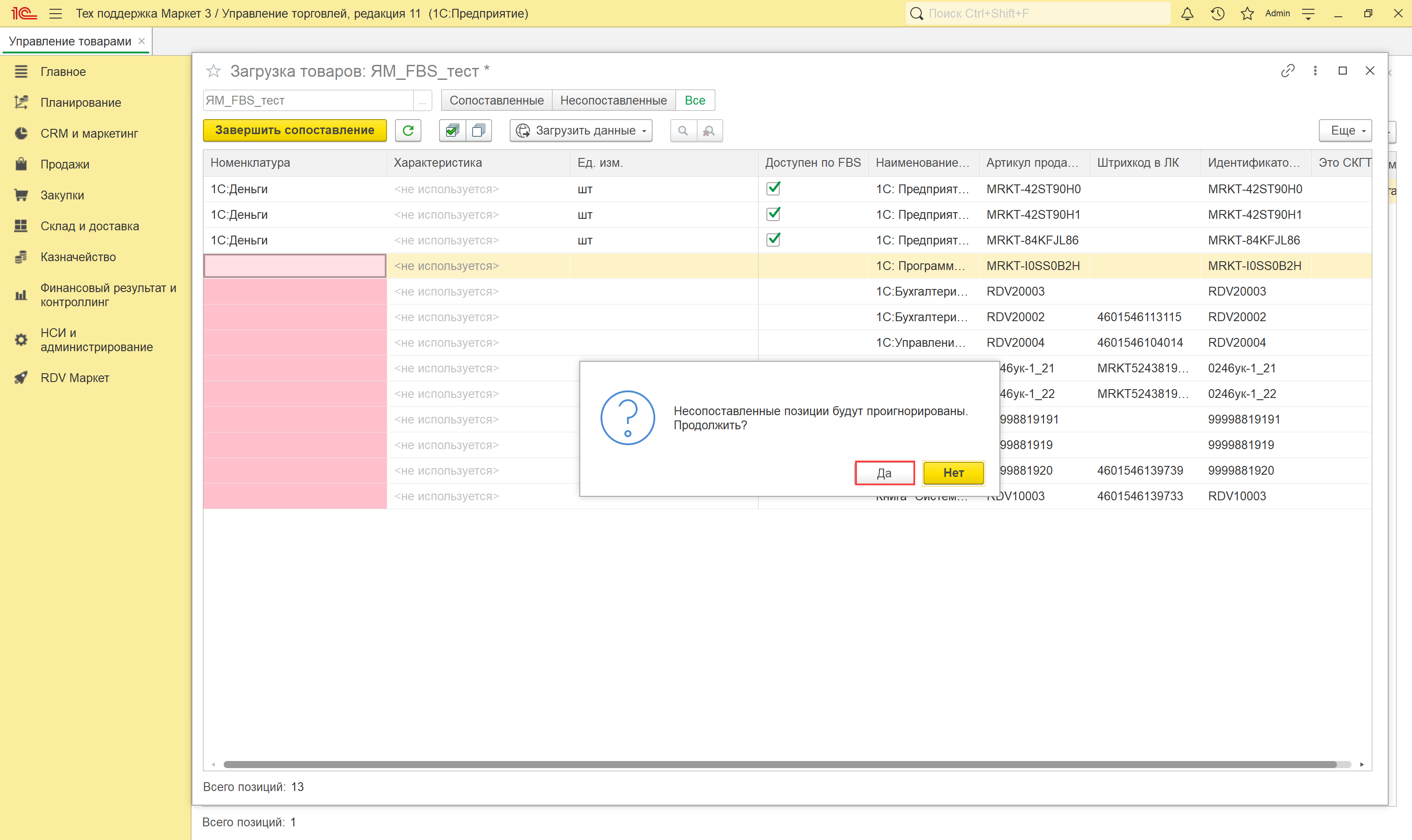 Если остались несопоставленные товары, - появятся предупреждение и они не будут записаны. Нажимаем "Да":