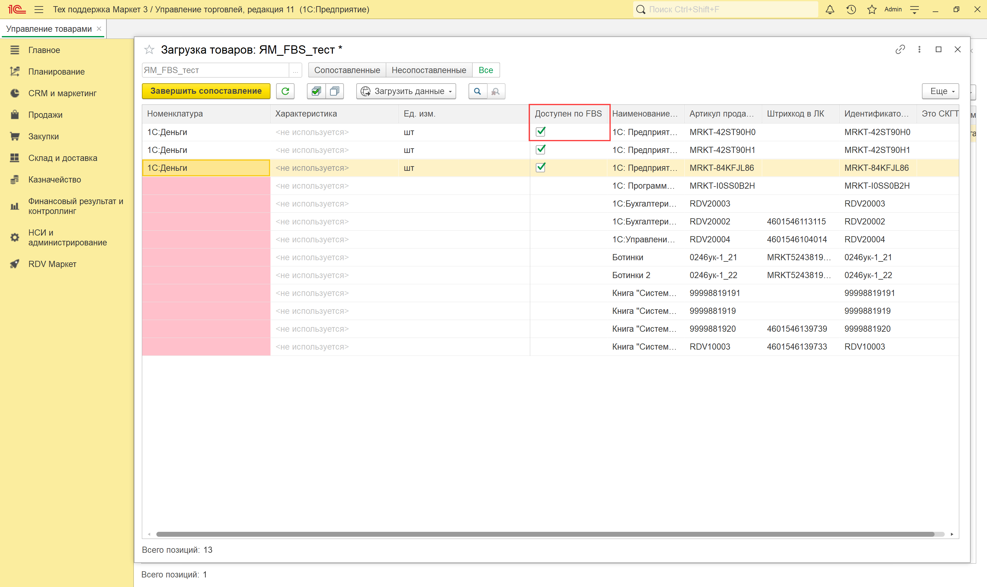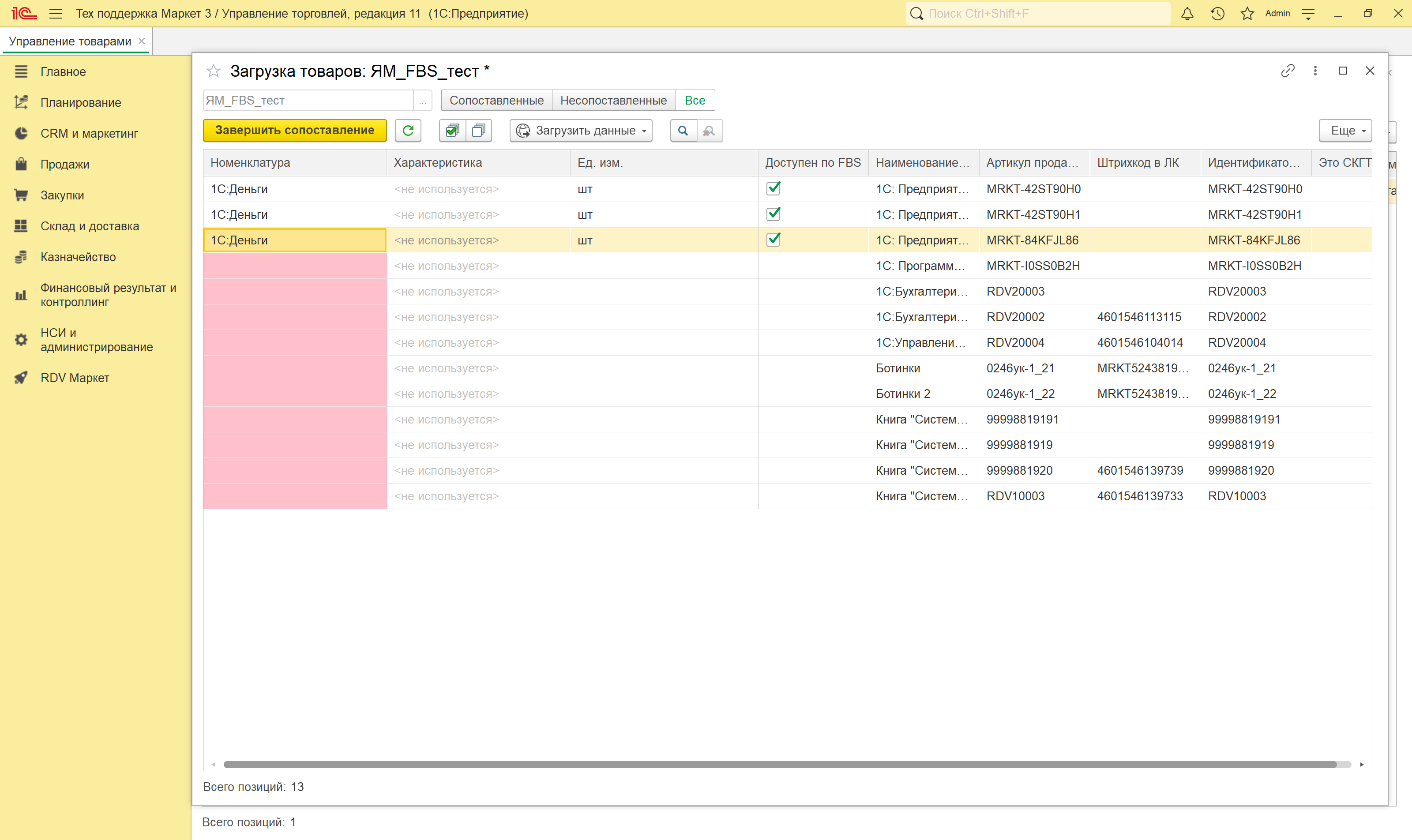 По итогам загрузки по API или из файла открывается новое окно, в котором происходит сопоставление товаров маркетплейса и номенклатуры в 1С.