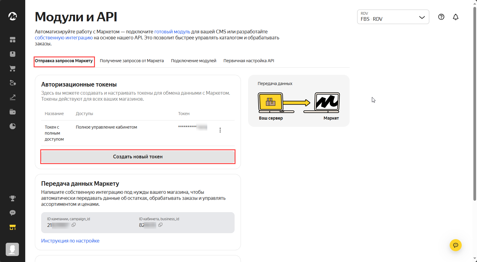 На вкладке "Отправка запросов Маркету" нажать на кнопку "Создать новый токен":