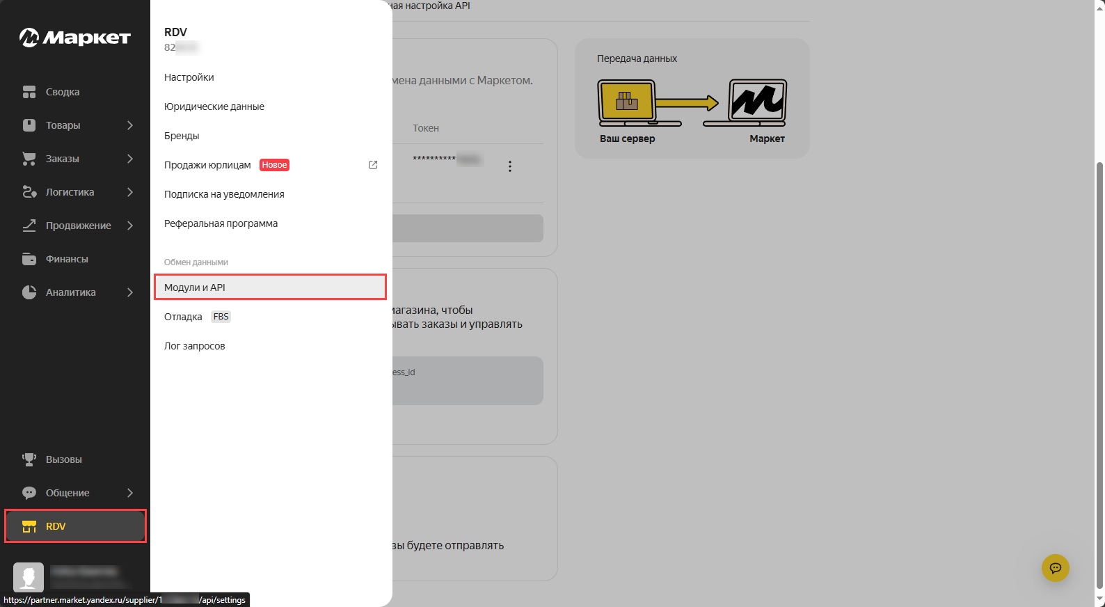 - Указать "API key" - это "Авторизационный токен", который можно найти в "Модули и API" в Личном кабинете Яндекс Маркет.