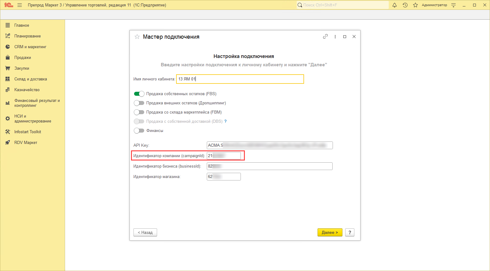 Указываем номер компании в поле "Идентификатор компании" в мастере подключения: