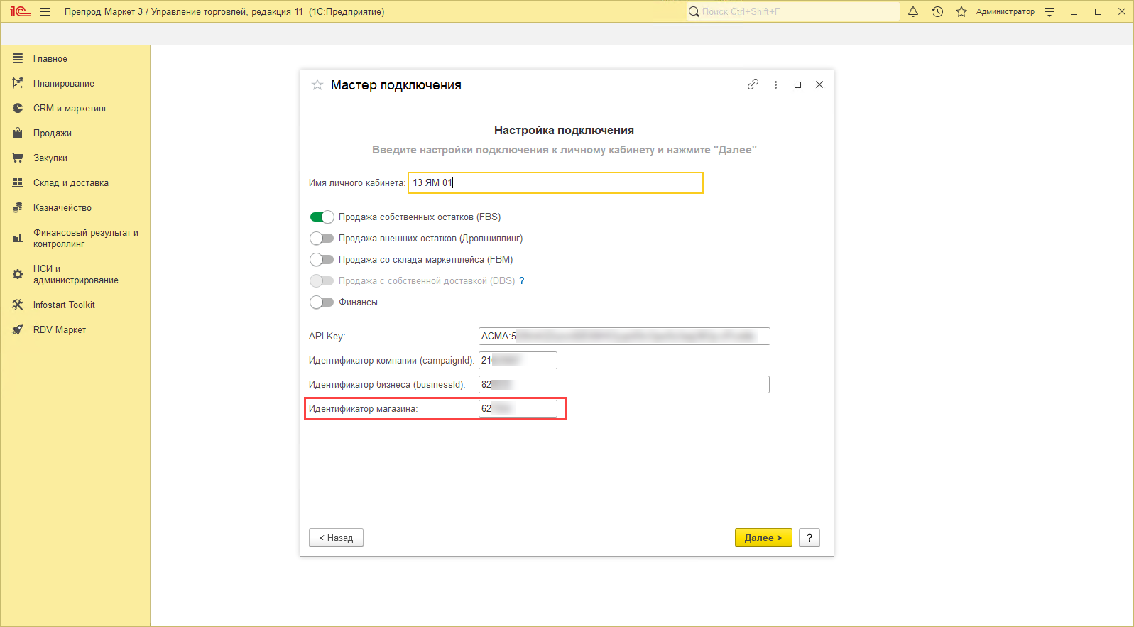 Шаг 3. Настройка подключения к личному кабинету Яндекс Маркет
