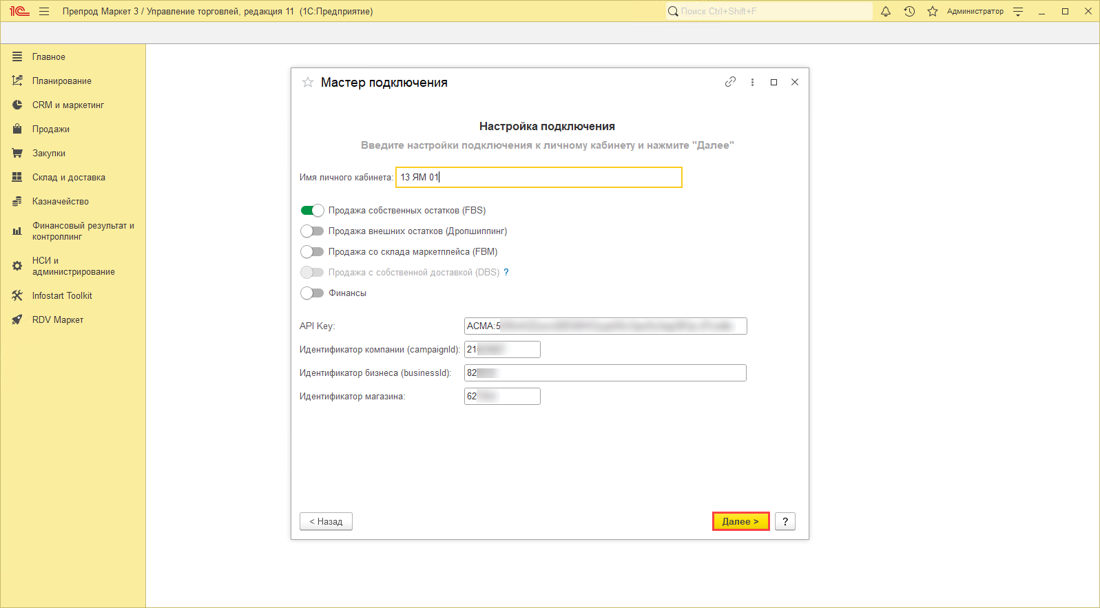 После чего необходимо Включить обмен с личным кабинетом и нажать кнопку "Далее":