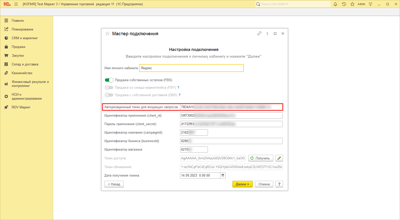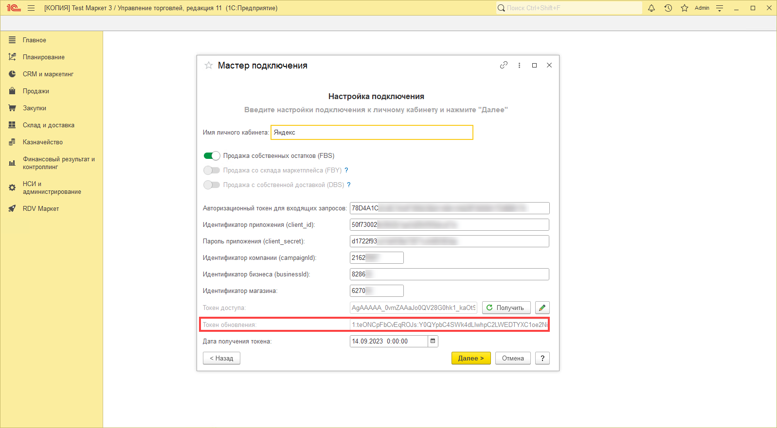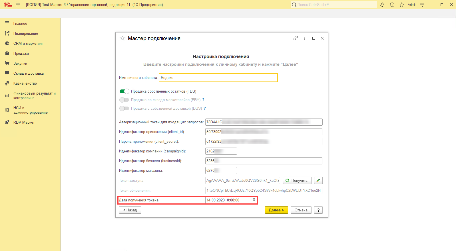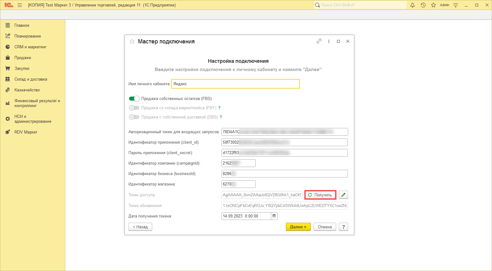 Токен доступа заполнится автоматически, он действует 364 дня. Чтобы обмен с Яндекс Маркетом по API не прекращался, необходимо вовремя обновлять токен доступа, например, за несколько дней до истечения срока годности токена.