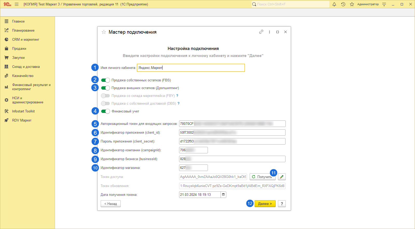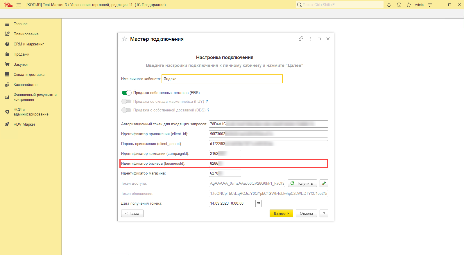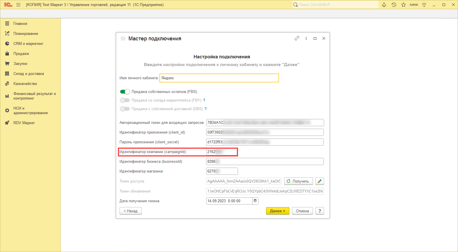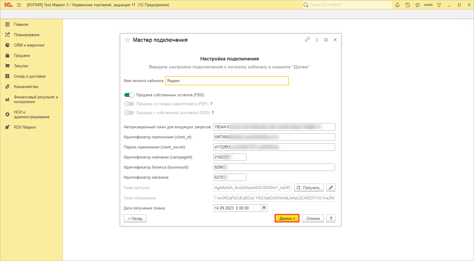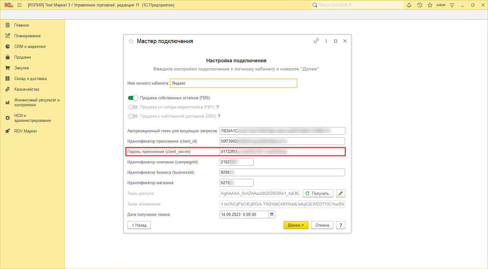 Токен доступа заполнится автоматически, он действует 364 дня. Чтобы обмен с Яндекс Маркетом по API не прекращался, необходимо вовремя обновлять токен доступа, например, за несколько дней до истечения срока годности токена.
