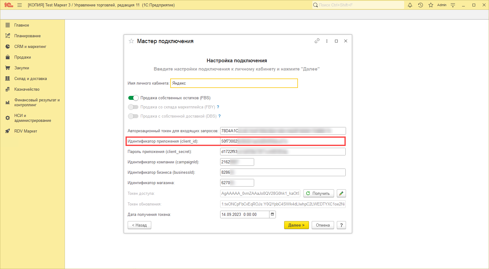 Поле "Идентификатор приложения" заполняется из созданного приложения Яндекс Маркет (ClientID), которое было создано на 1 шаге данной инструкции.
