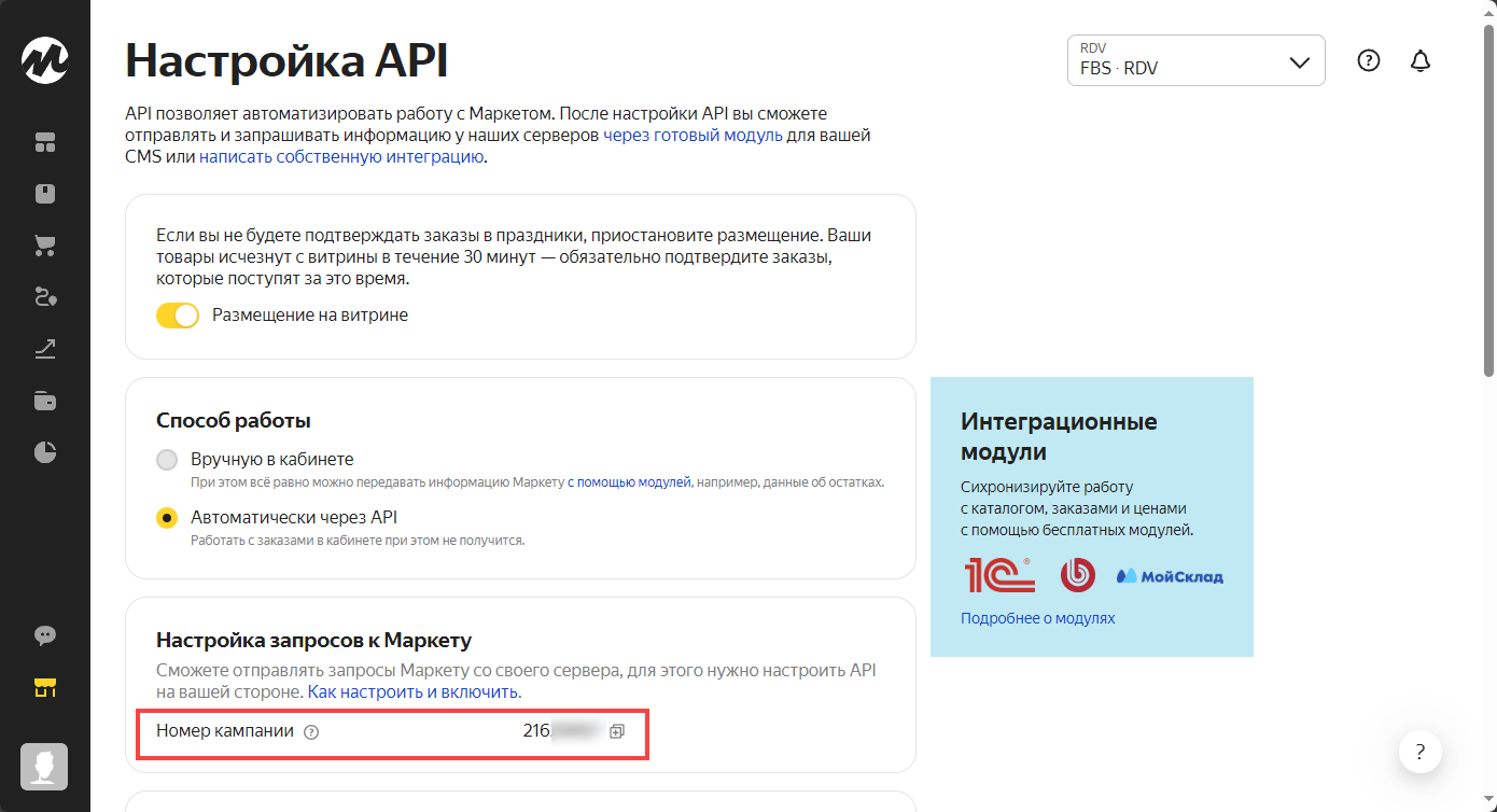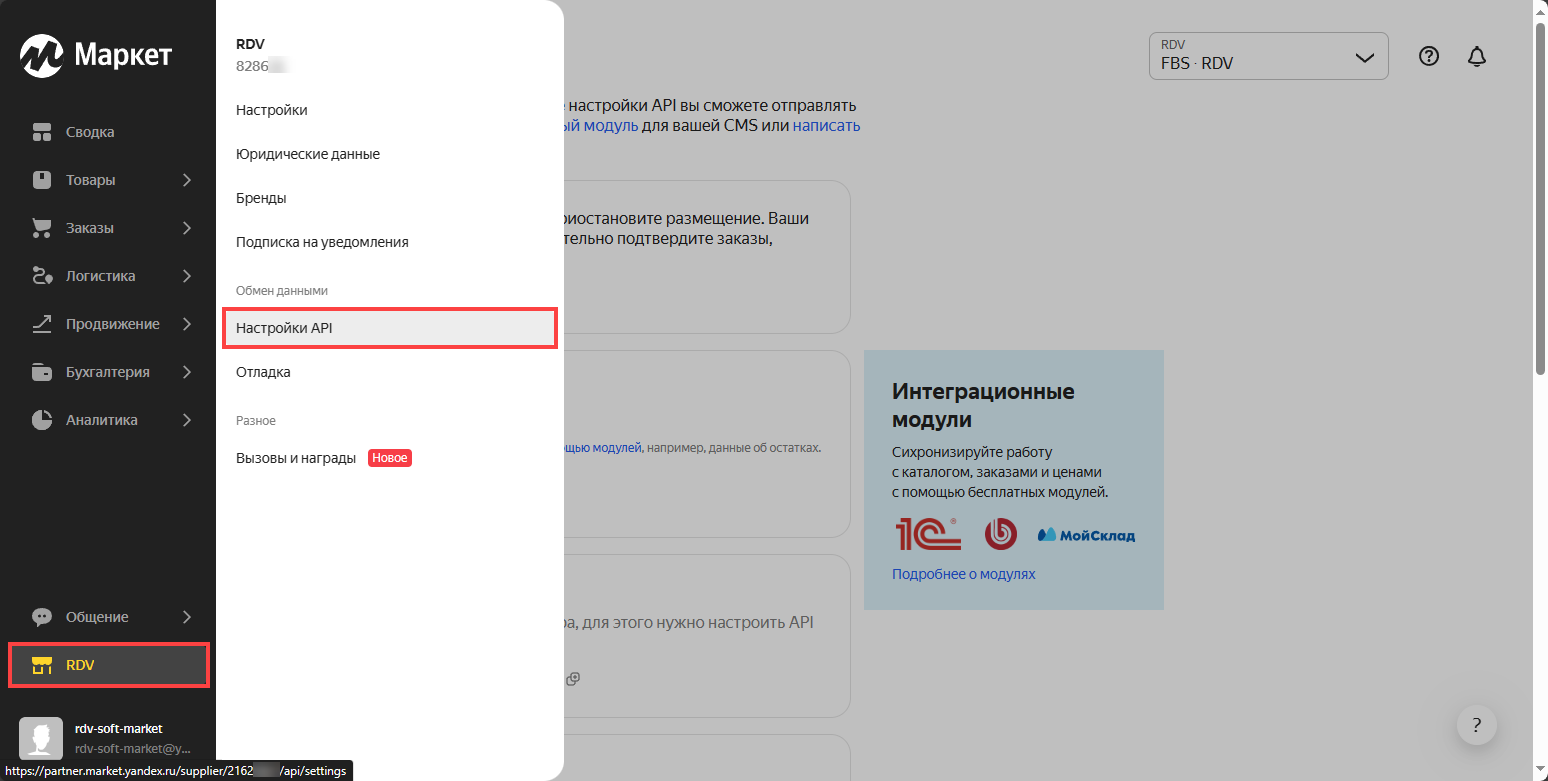 Для того чтобы получить "Авторизационный токен" необходимо перейти в Личный кабинет, выбрать магазин FBS для которого выполняется настройка и перейти в "Настройки API":
