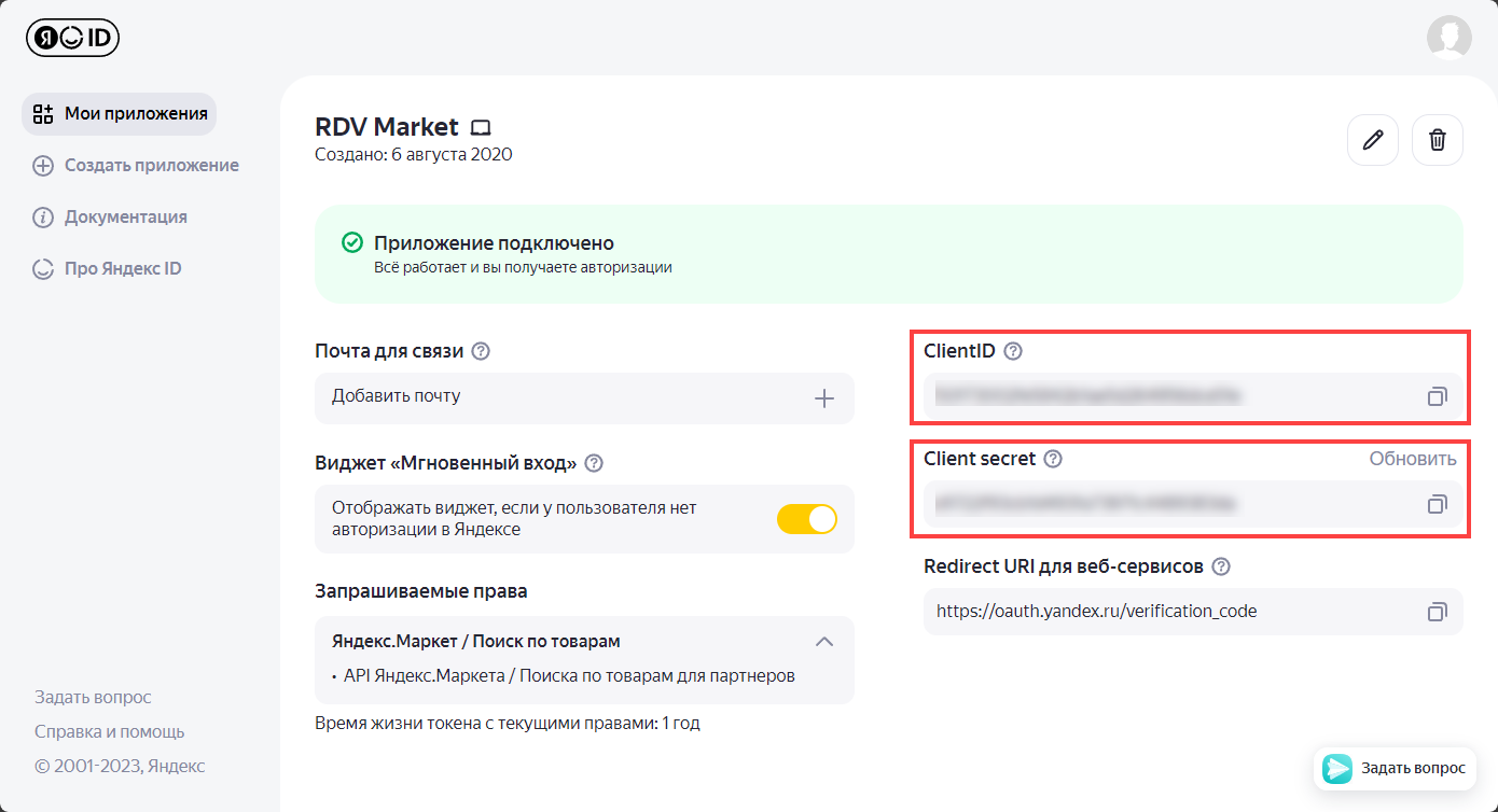 После создания приложения, отобразится справочная информация ("ClientID" и "Client secret"), которую необходимо сохранить для указания в настройках подключения к ЛК.