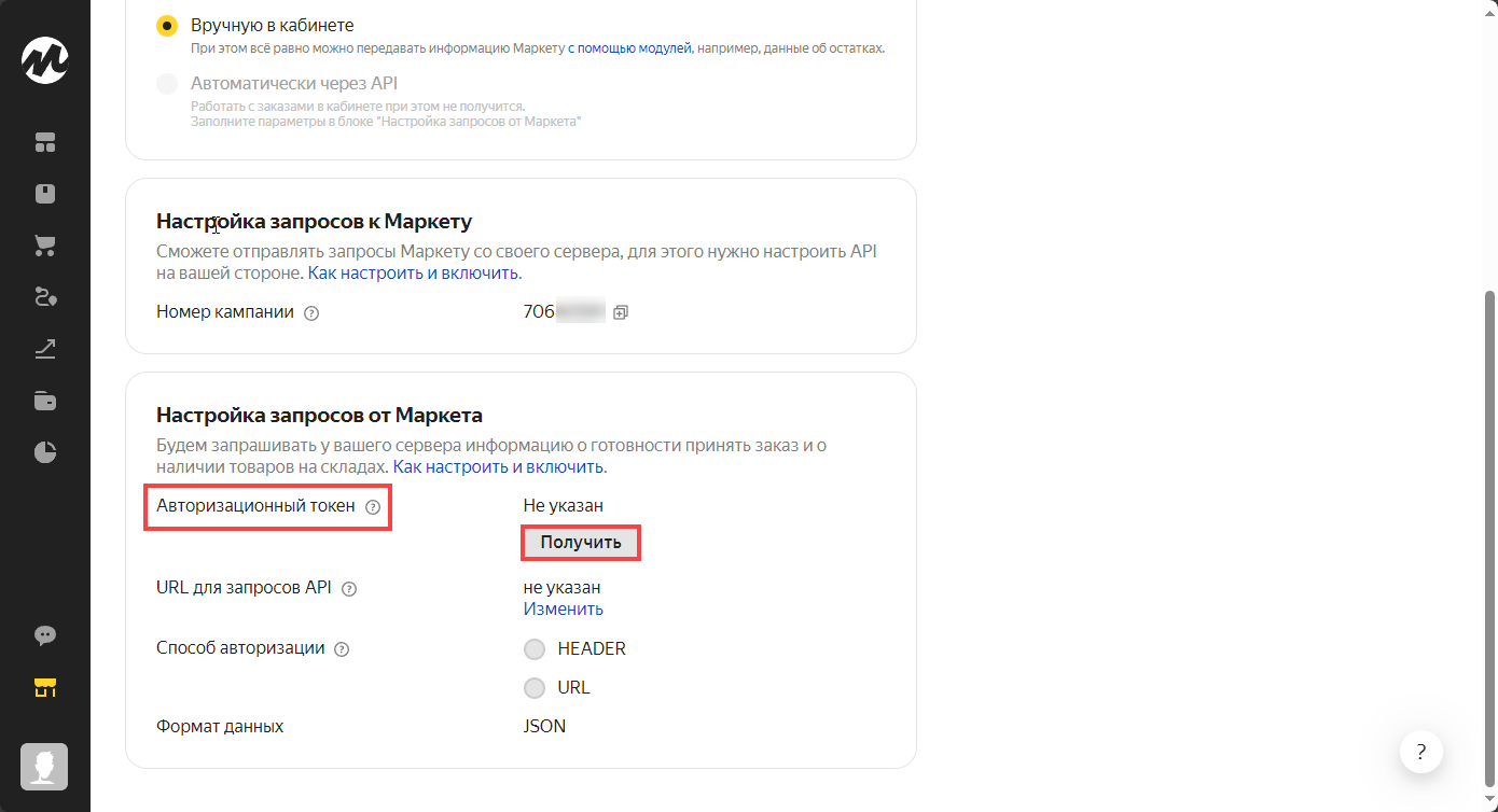 - Указать "Авторизационный токен для входящих запросов" - это "Авторизационный токен", который можно найти в "Настройках подключения API" в вашем Личном кабинете Яндекс Маркет.