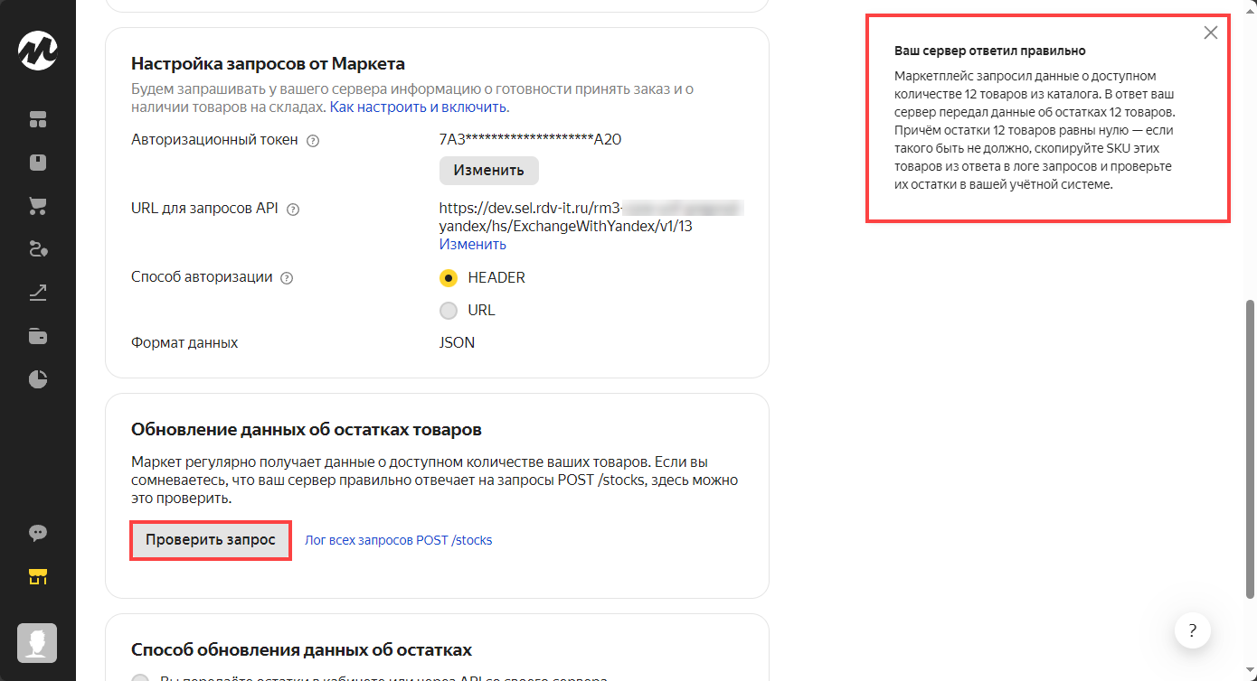 В блоке "Обновление данных об остатках товаров" нажмите кнопку "Проверить запрос". В верхнем правом углу должно появиться всплывающее окно, что остатки получены.