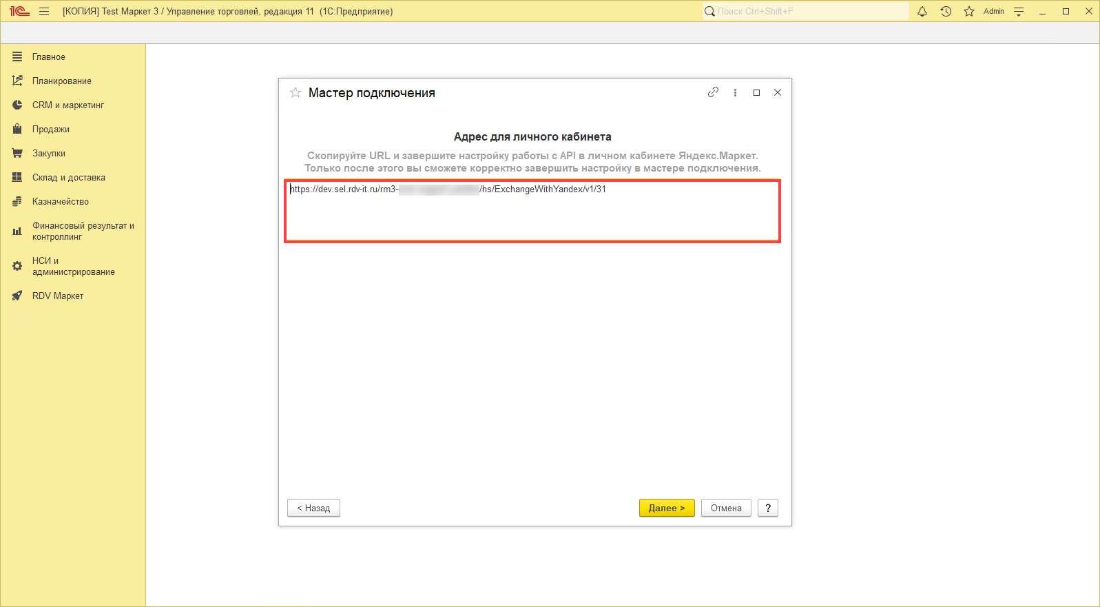 - Указываем название. Например "Интеграция с маркетплейсом Я.Маркет из 1С RDV Маркет".