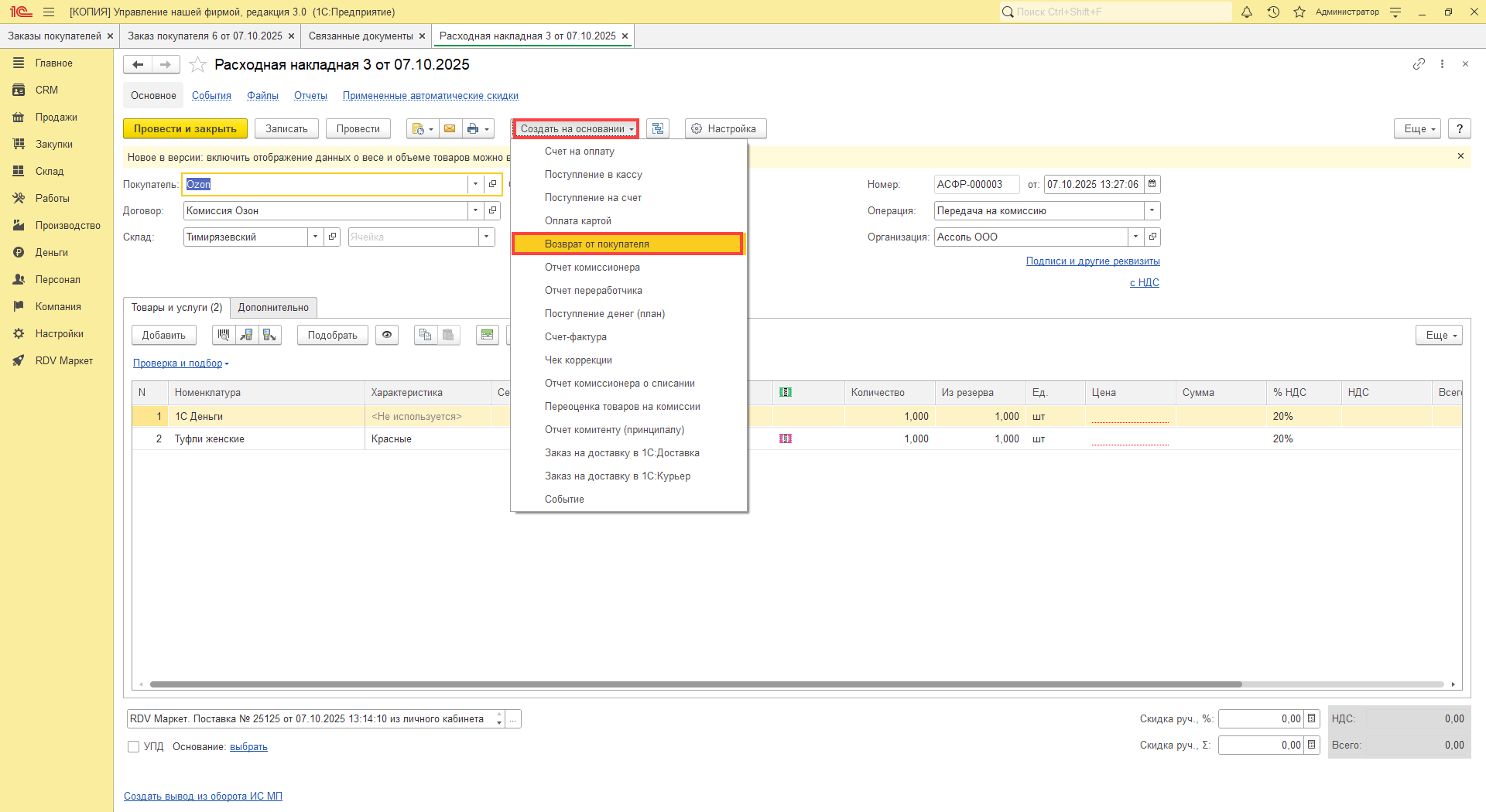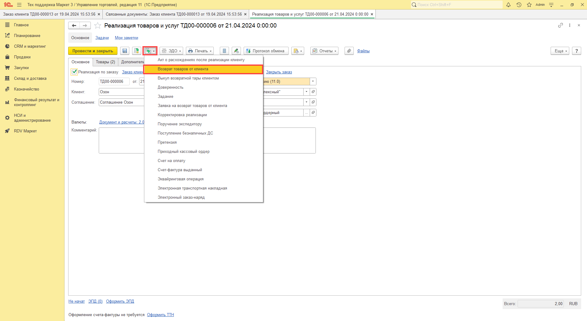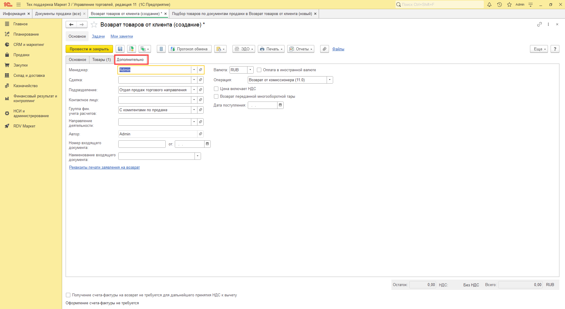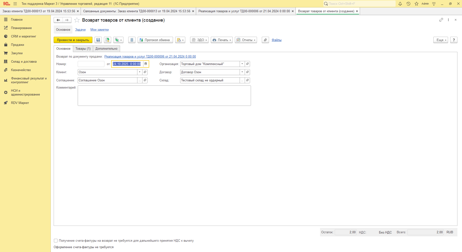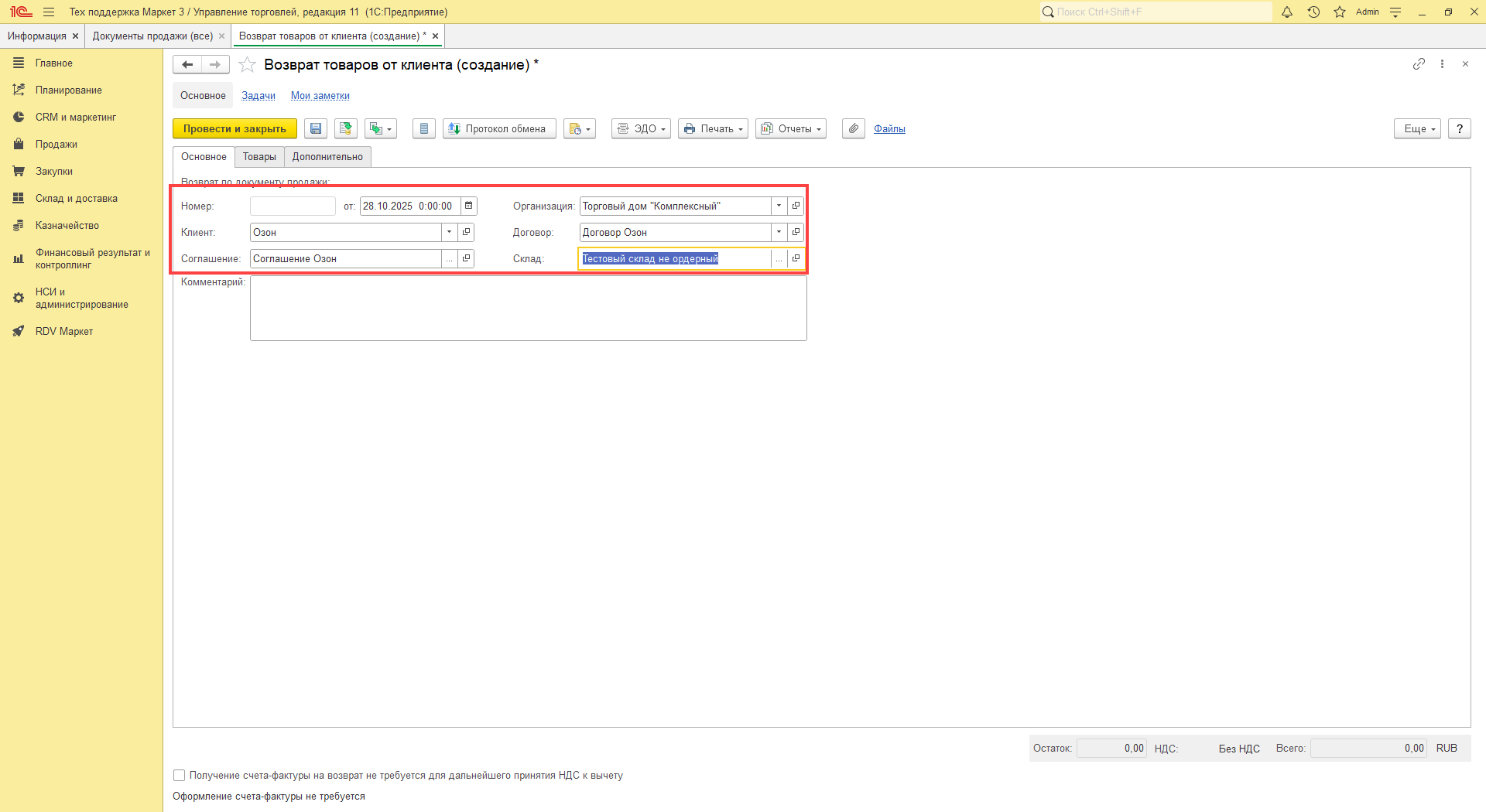- Организацию, Соглашение с клиентом, договор и склад, на который будет оприходован возвращаемый товар