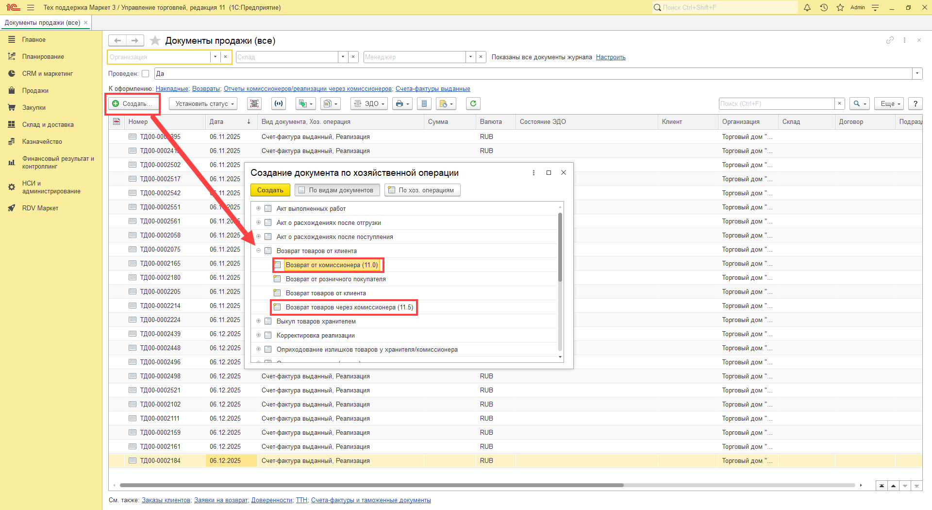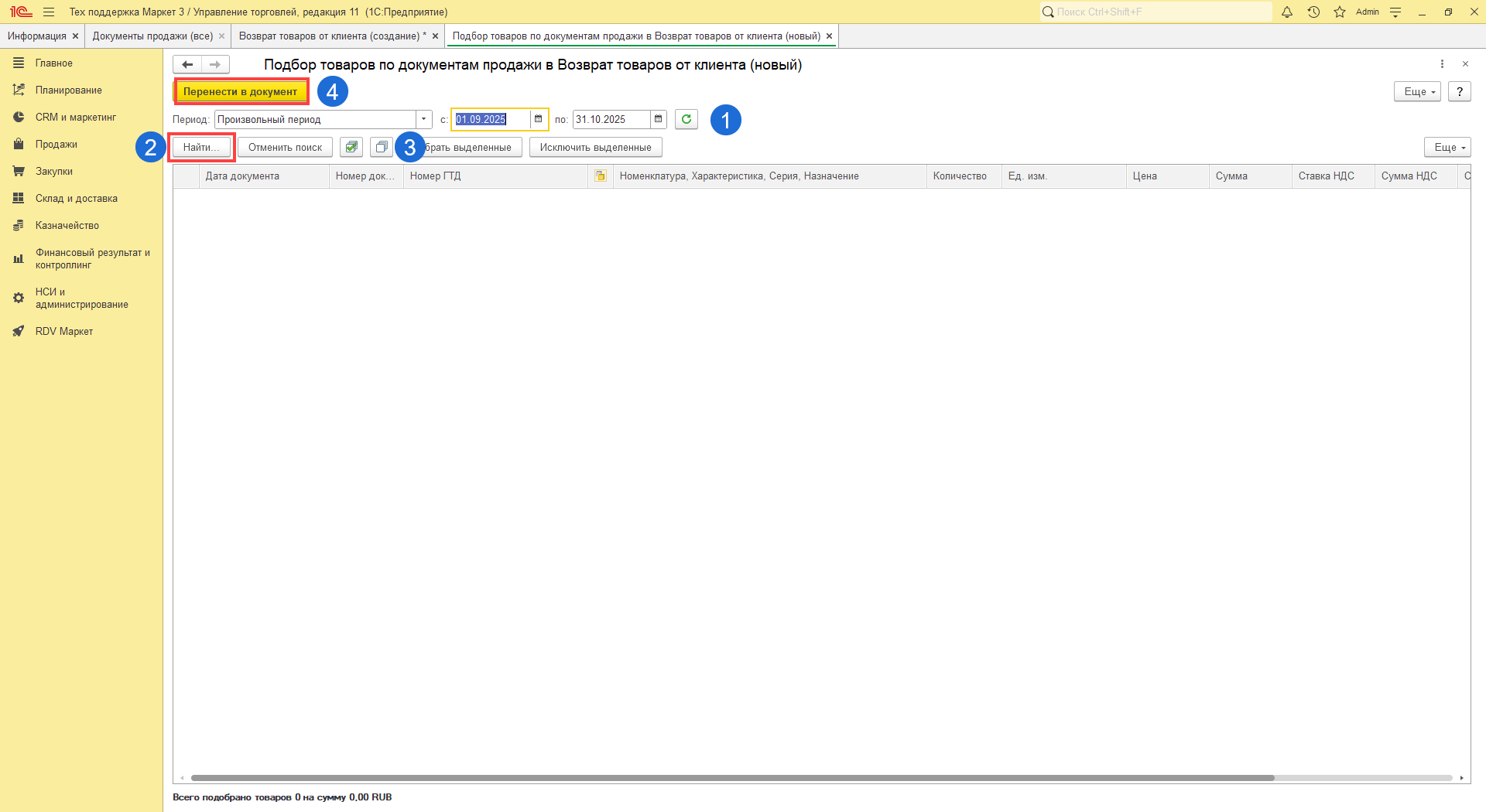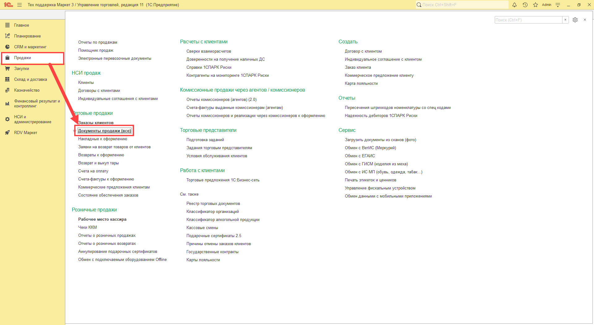 В случае, если документ "Возврат товаров от клиента" создается не на основании документа продажи, то для создания документа "Возврат товаров от клиента" необходимо перейти в раздел "Продажи" - "Документы продажи все":