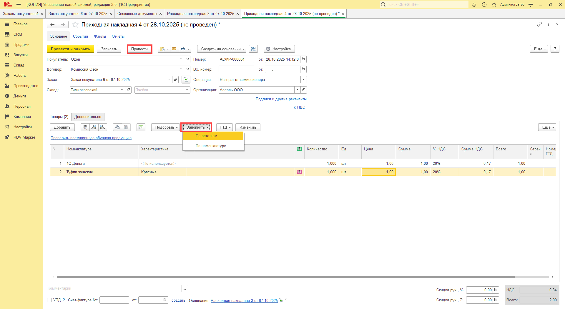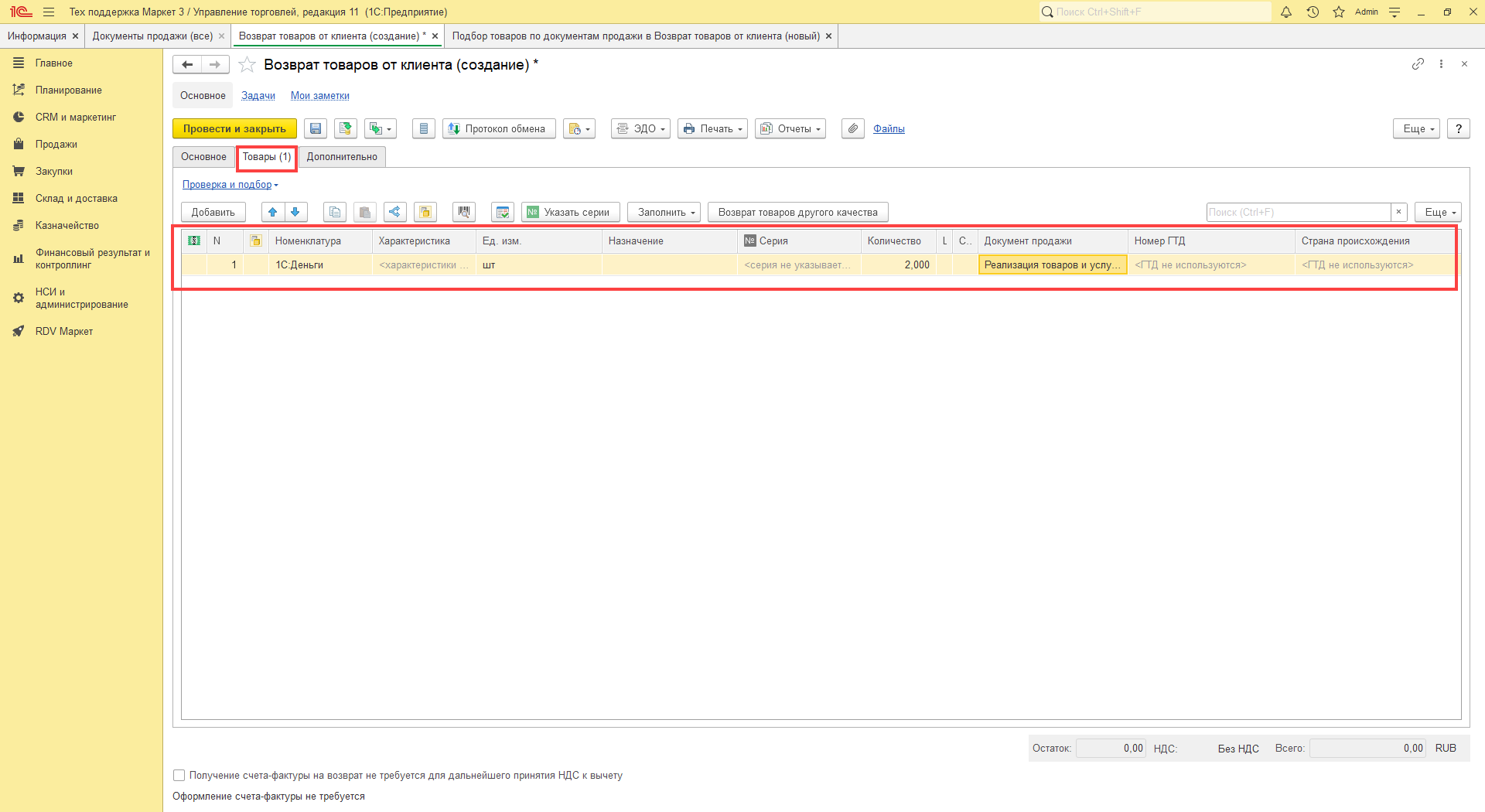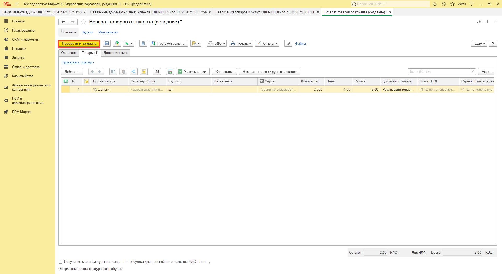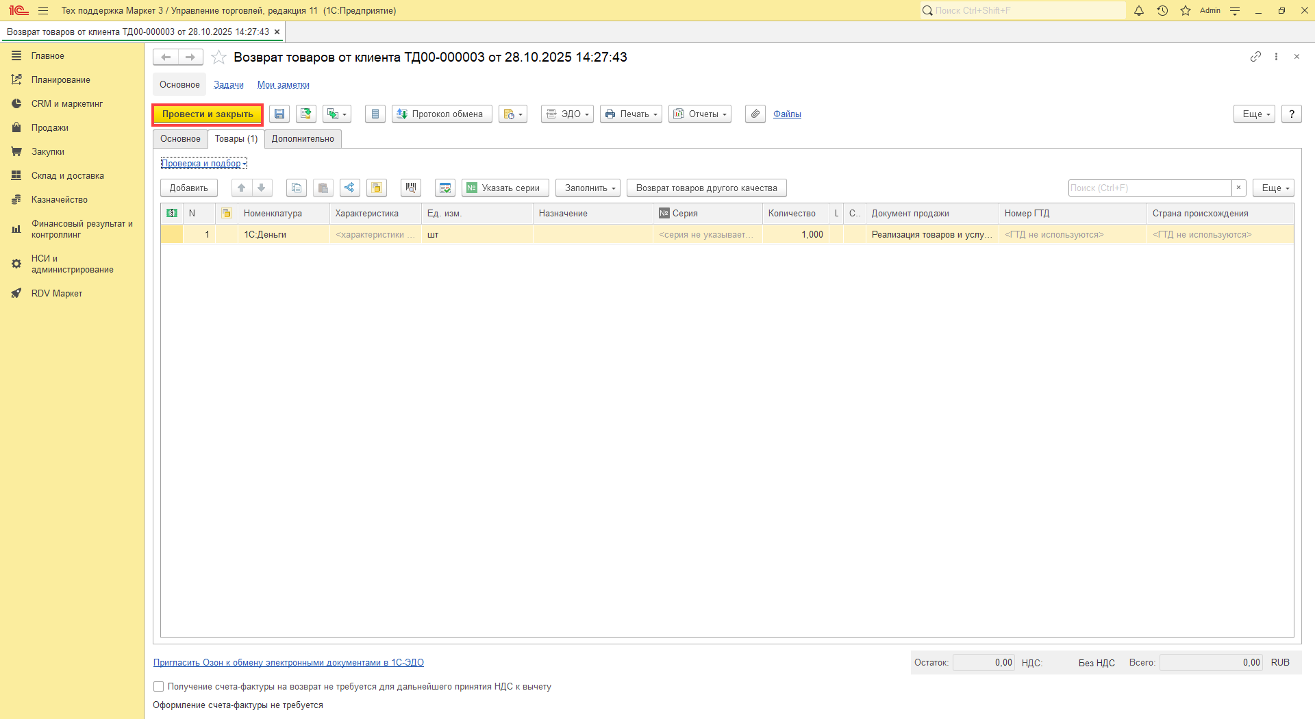 Необходимо проверить список возвращаемых товаров, после чего провести документ посредством нажатия кнопки "Провести и закрыть":