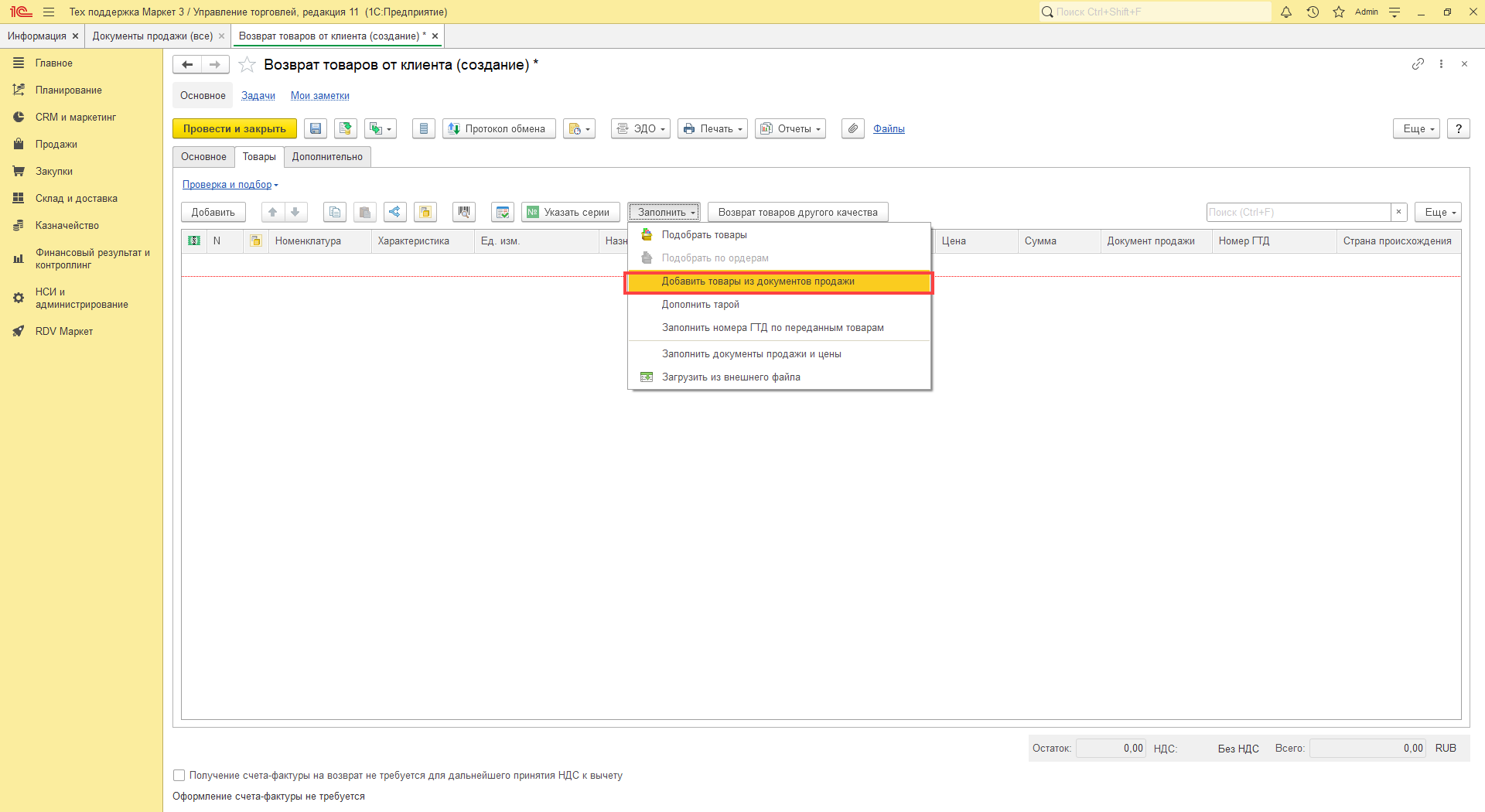 На вкладке "Товары" для добавления товара необходимо нажать "Заполнить", выбрать способ заполнения "Добавить товары из документов продажи":