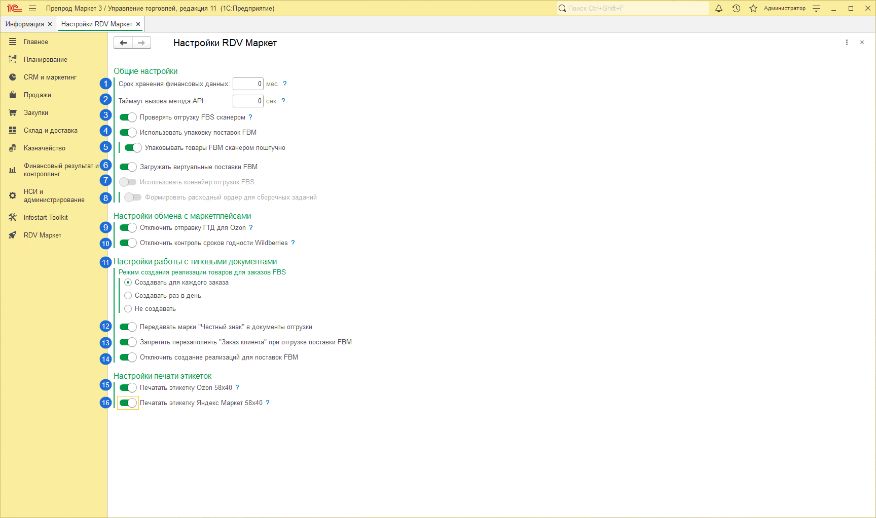 В разделе "RDV Маркет" - "Настройки RDV Маркет" можно выполнить общие настройки для модуля RDV.
