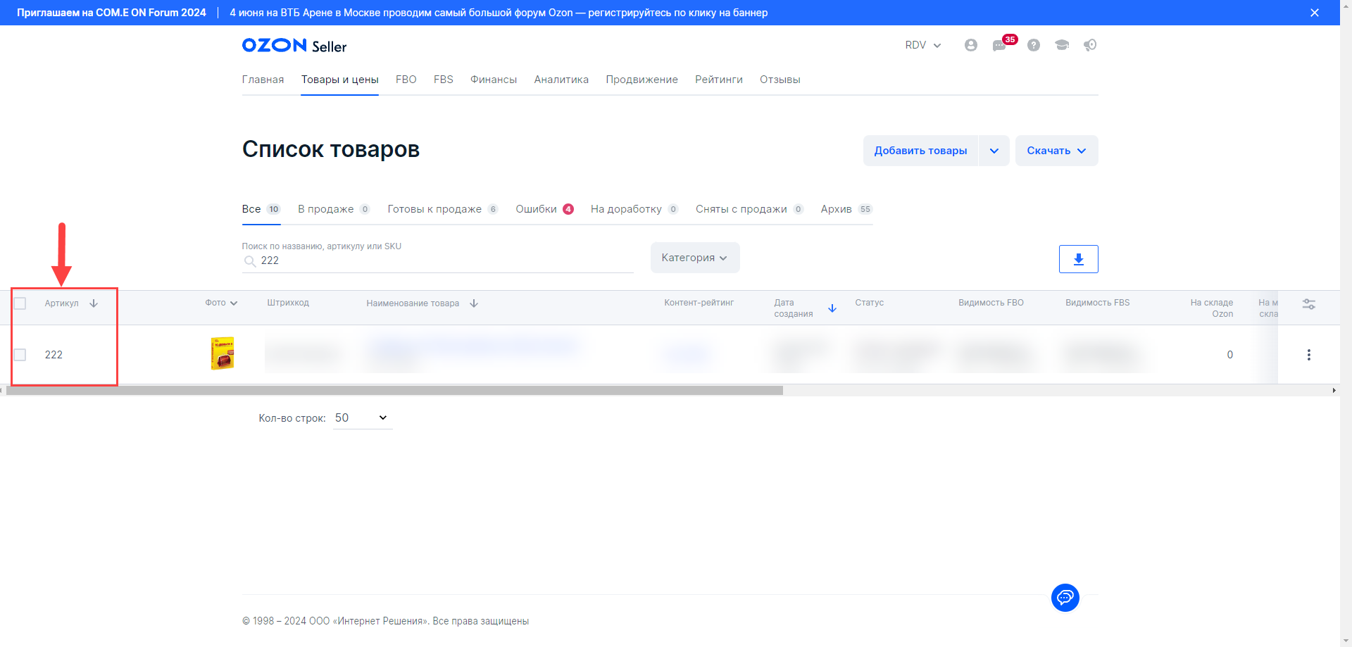 "Артикул Поставщика" соответствует Артикулу товара в Личном кабинете Ozon: