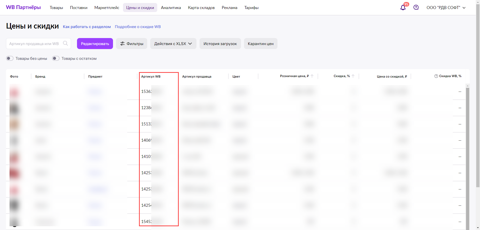 На маркетплейс Wildberries данные по ценам передаются по "Артикулу в ЛК" в "Управлении товарами", равному "Артикулу WB" в файле c товарами из ЛК: