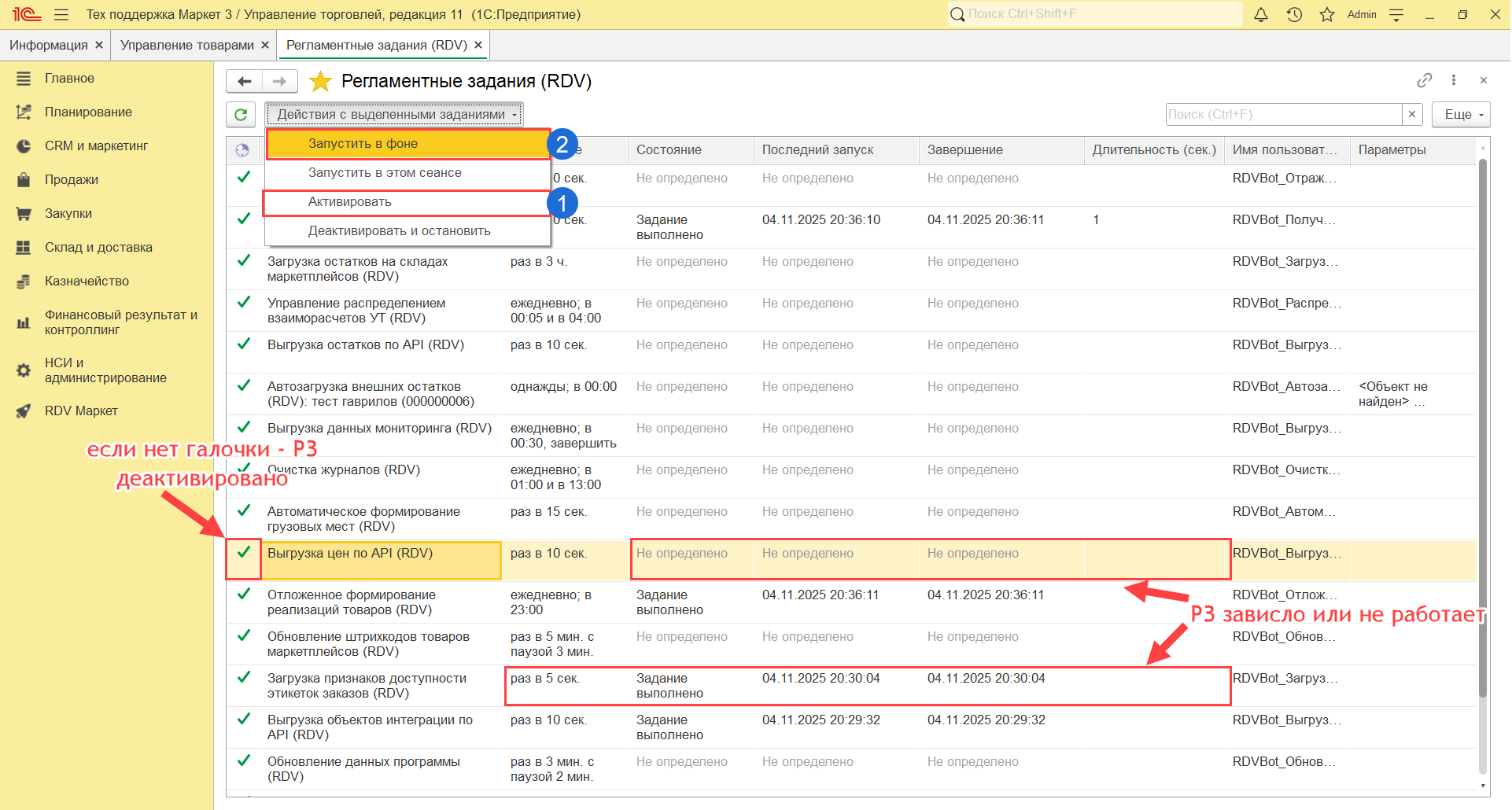 Если вы арендуете базу на нашем сервере, то для проверки блокировки РЗ и их перезапуска можно создать запрос в техническую поддержку RDV Маркета на почту support@rdv-it.ru . Если вы не арендуете базу на нашем сервисе, и вручную запуск регламентных заданий не решил вопрос о передачи цены, то рекомендуем обращаться к вашим системным администраторам или IT-специалистам.