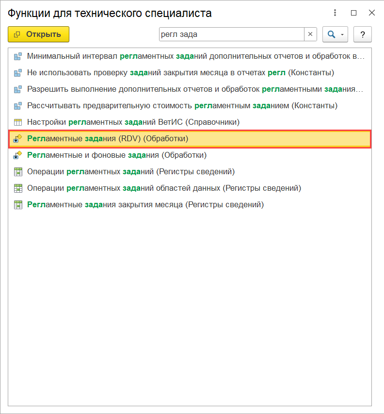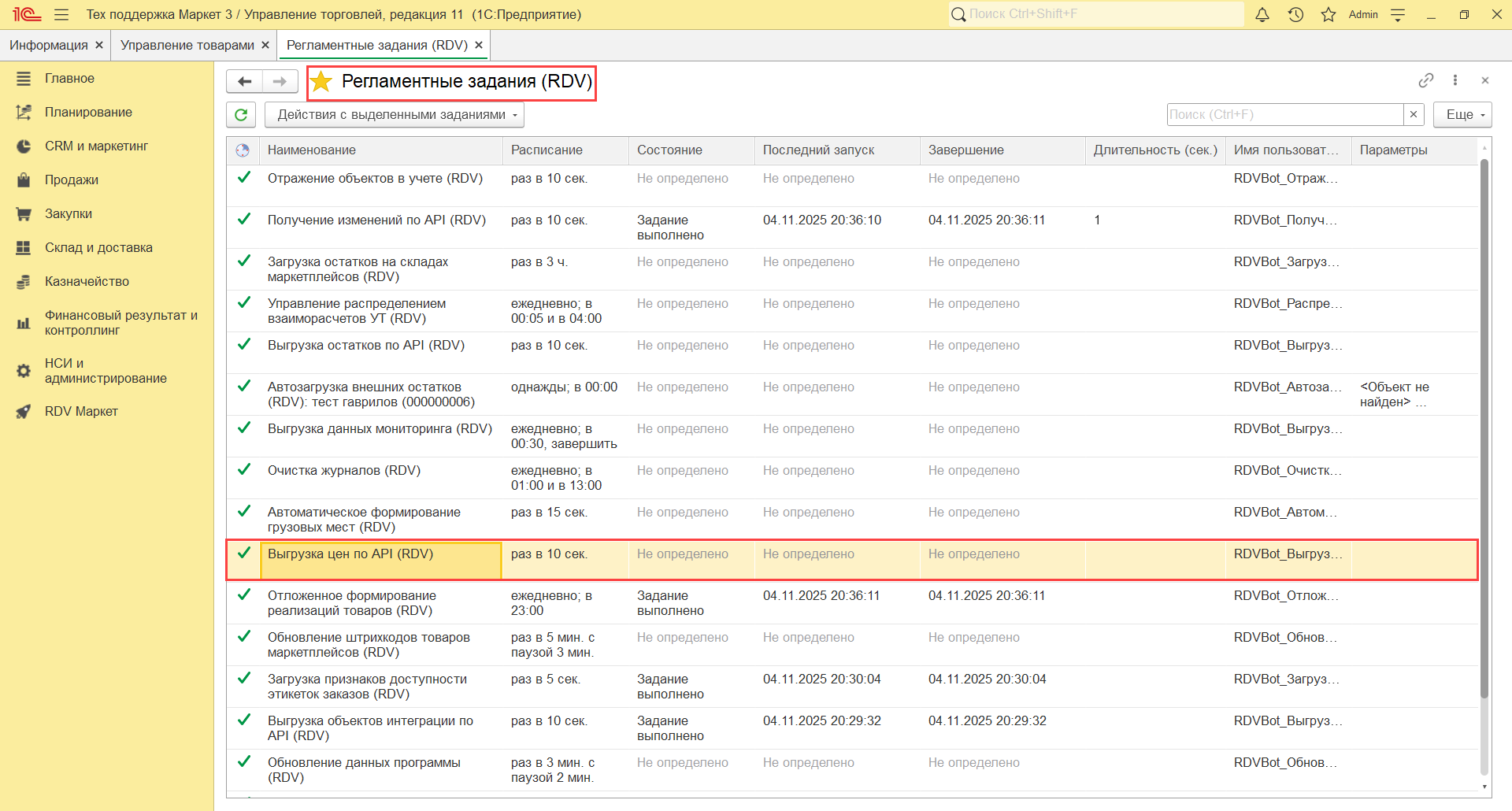 Также, на обмен ценами влияет регламентное задание "Выгрузка цен по API (RDV)" . Путь: "Сервис и настройки" - "Функции для технического специалиста" - "Регламентные задания (RDV) (Обработки)":