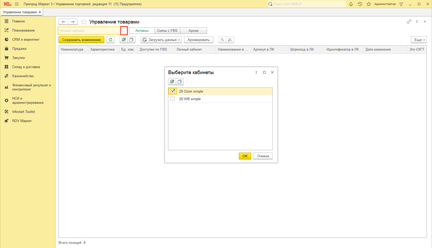 При открытии формы включен отбор только по Активным в Личном кабинете товарам и не выбран ЛК