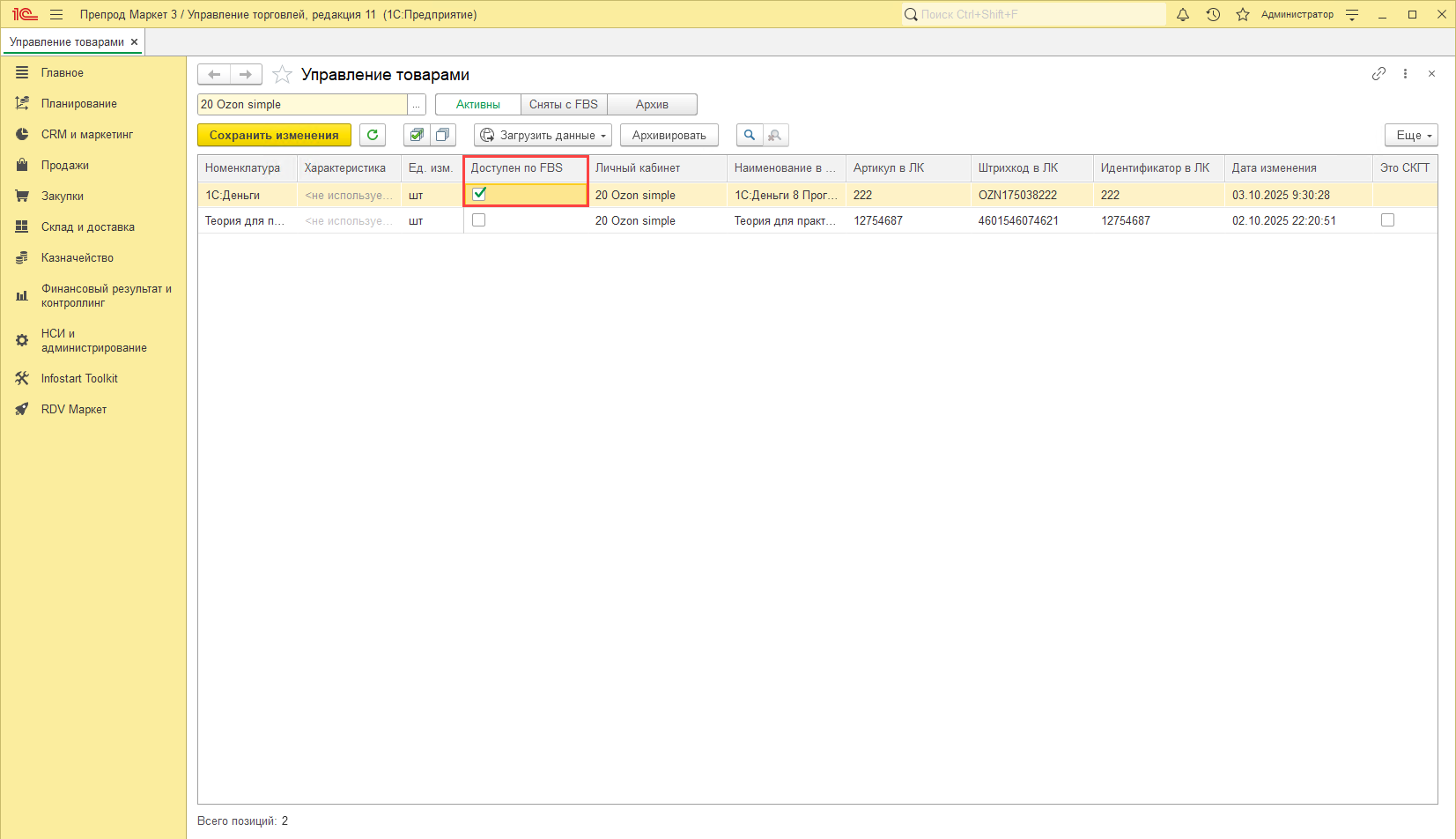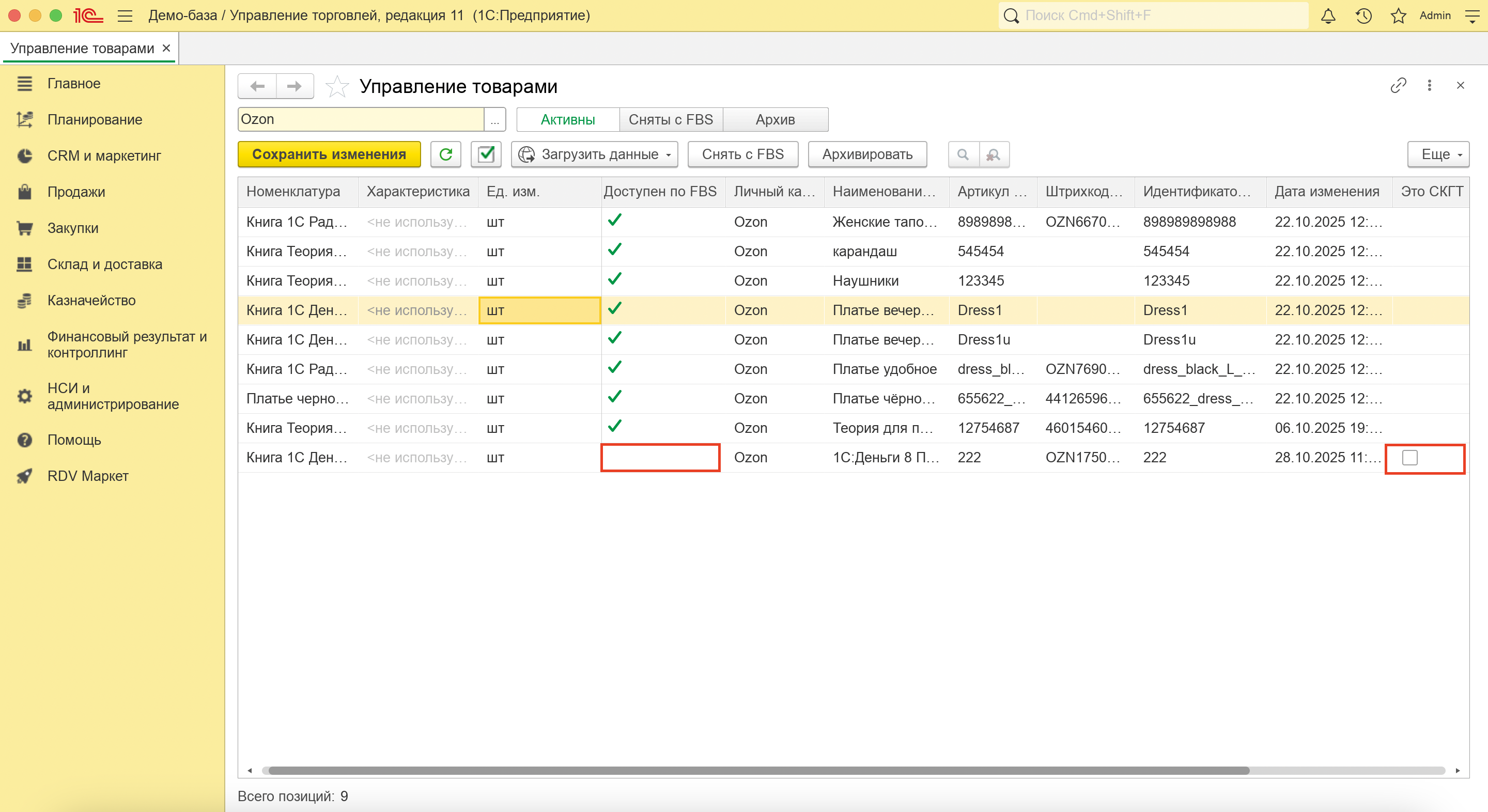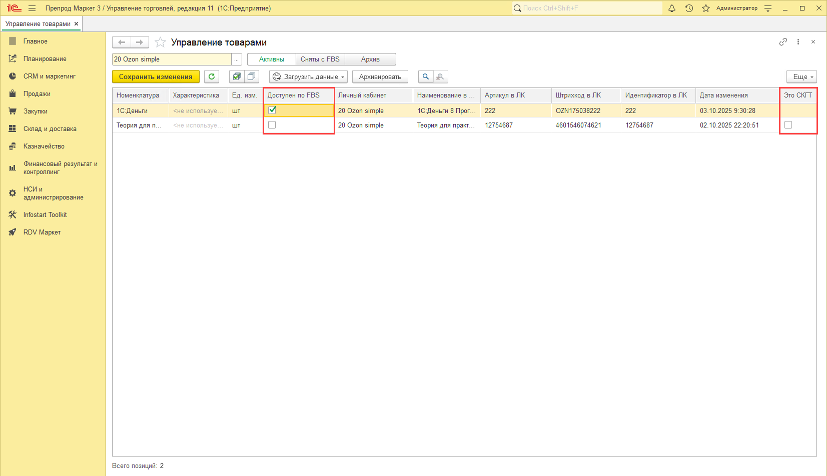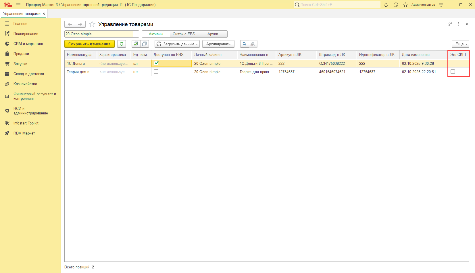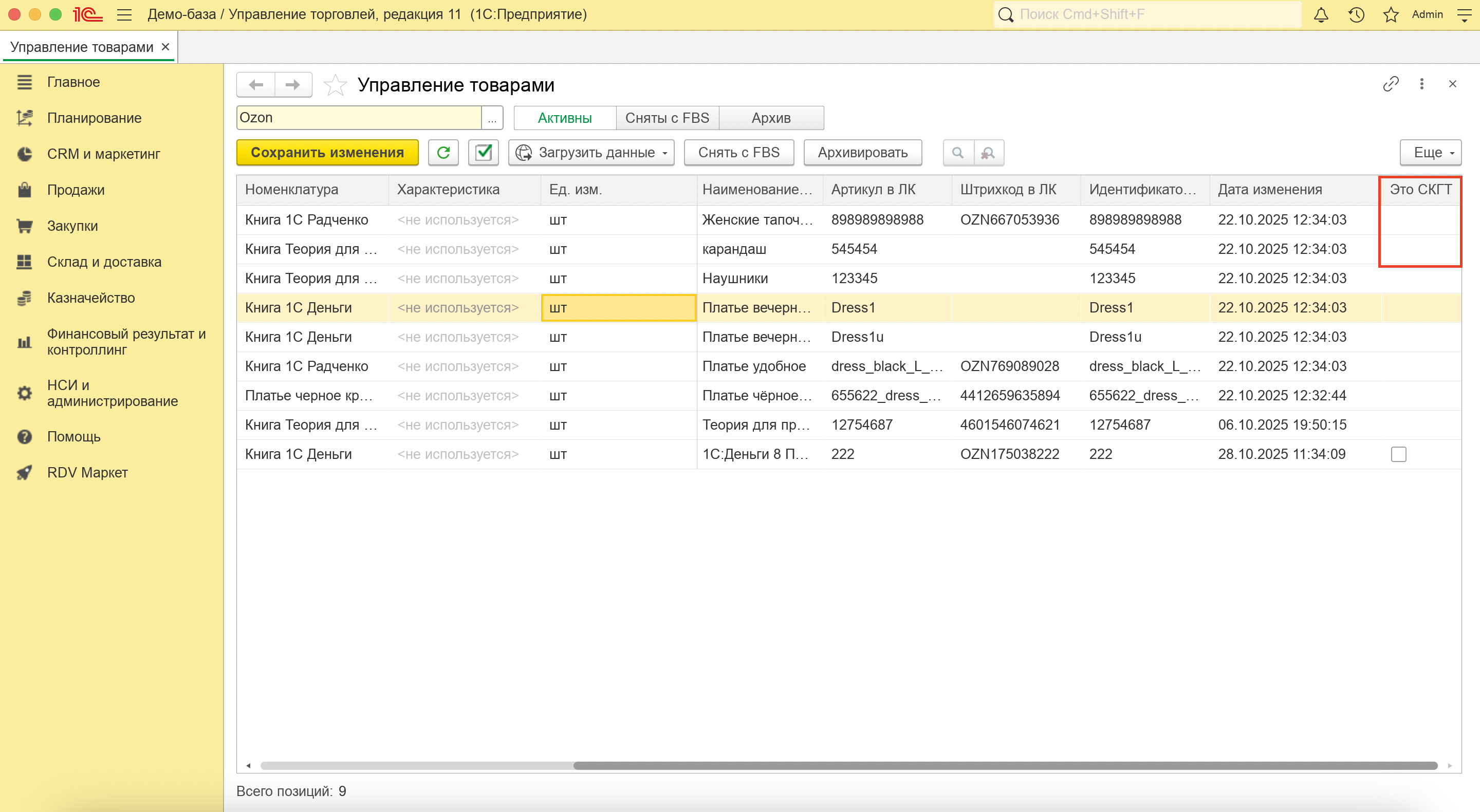 Для товаров маркетплейса Ozon добавлен признак "Это СКГТ" в "Управлении товарами":