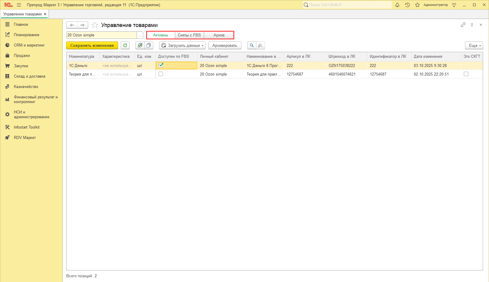 - Активны - товары, которые доступны к продаже по схемам FBS и FBM