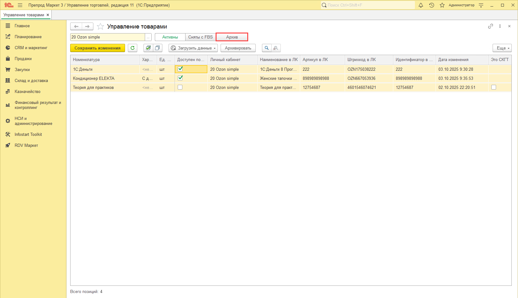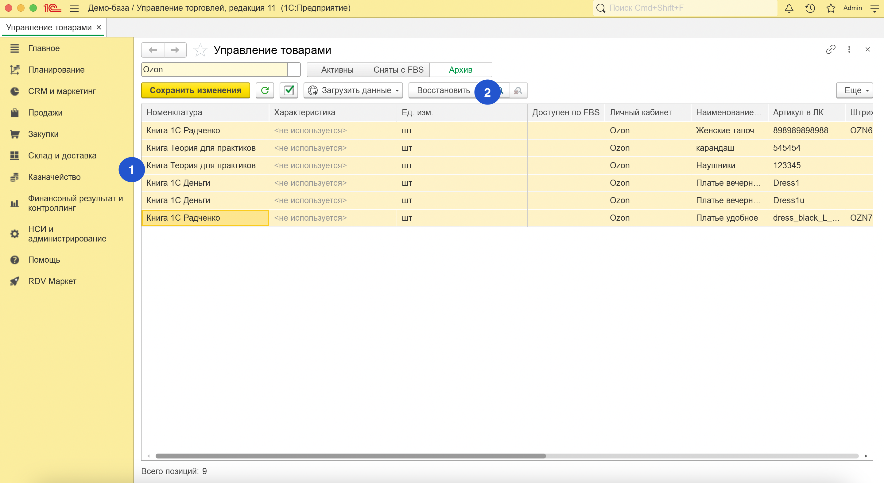 Функция "Архив" позволяет убирать из основного списка карточки, которые больше не продаются на маркетплейсах, и хранить их отдельно от актуальных товаров.
