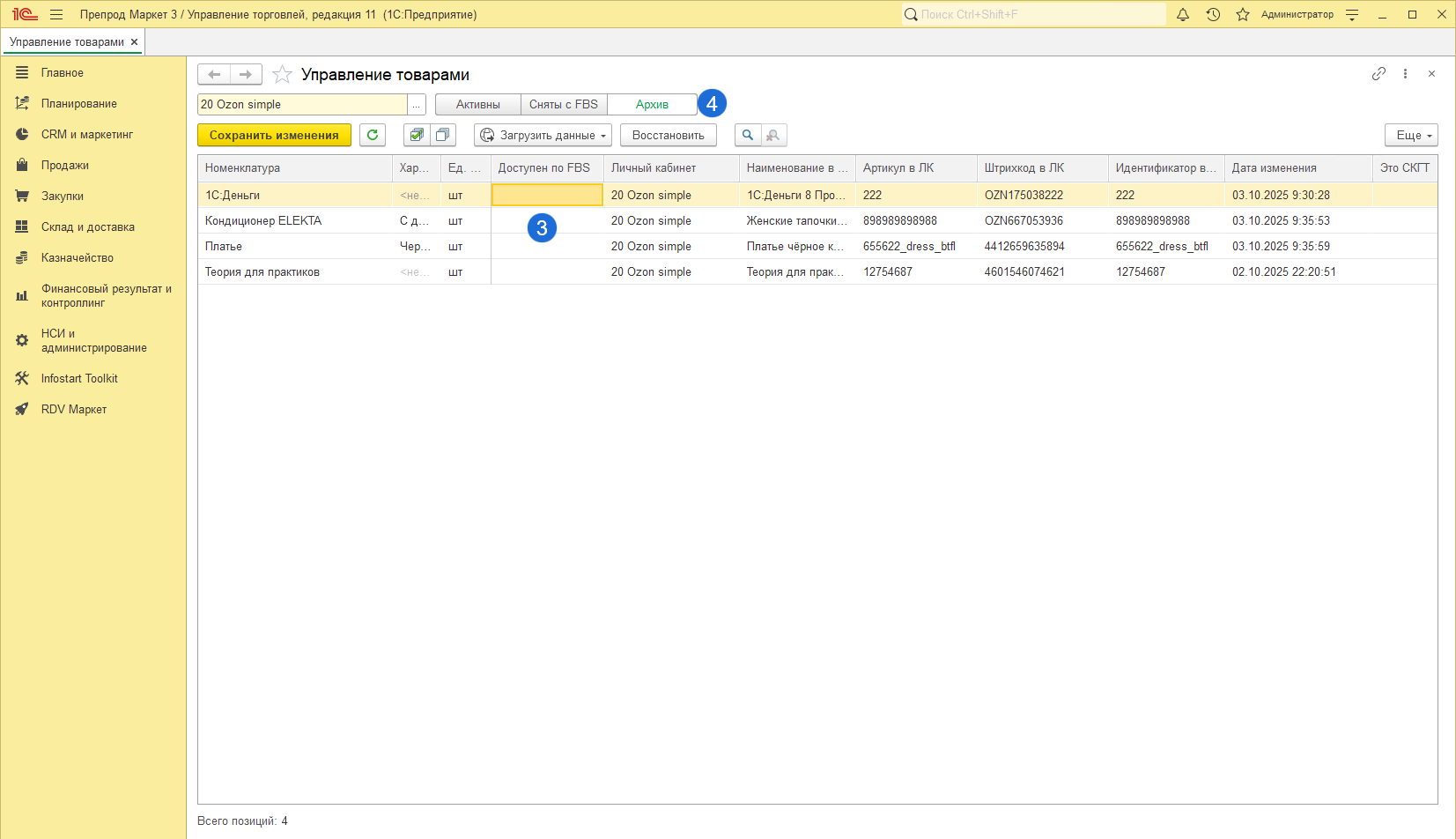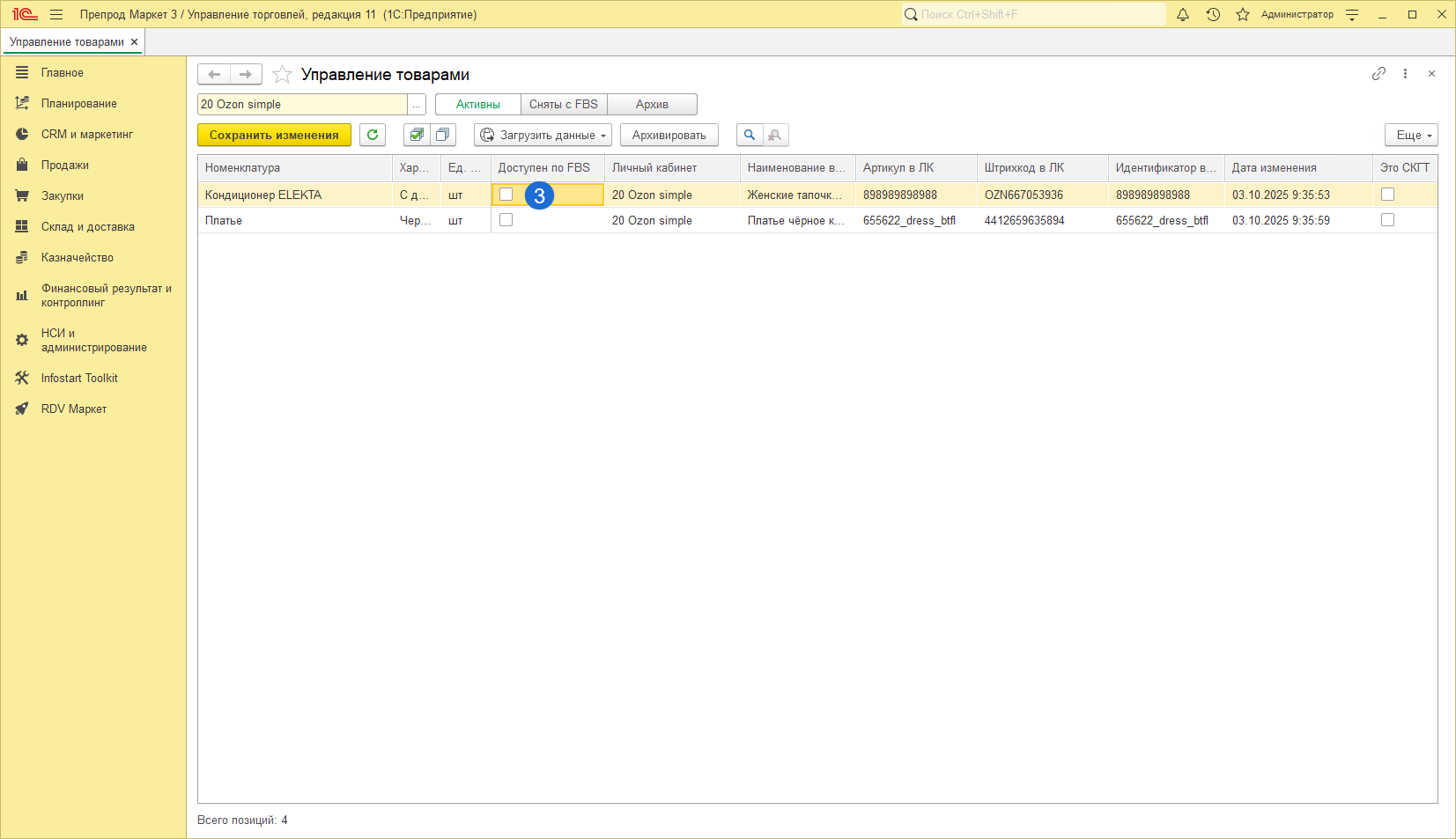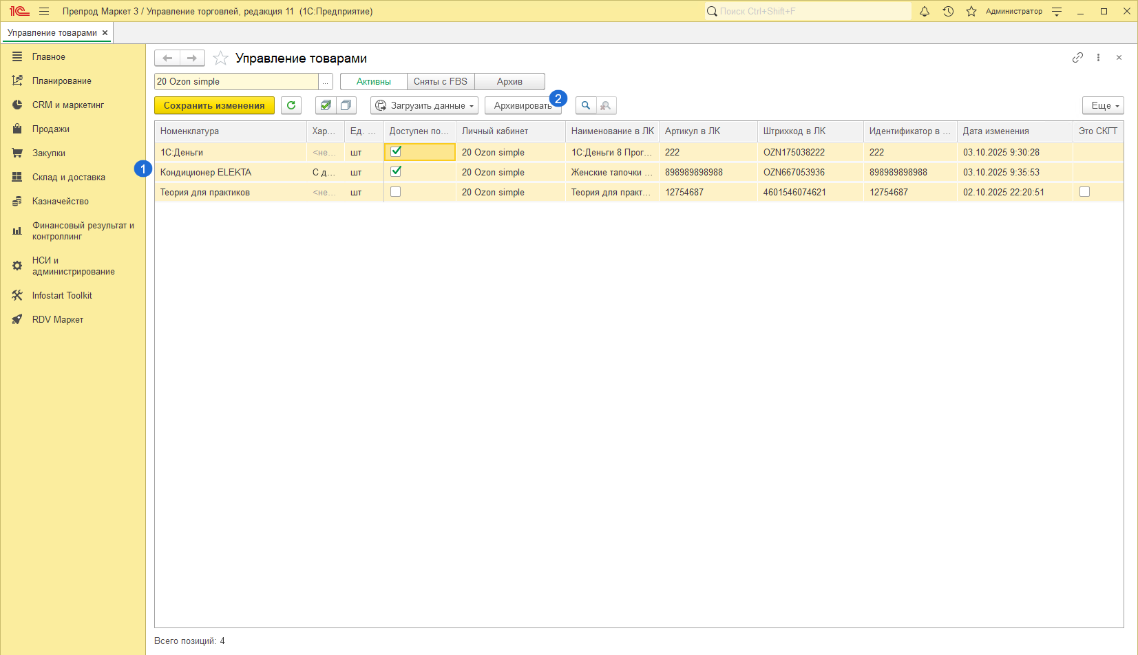 Работа с товарами Ozon