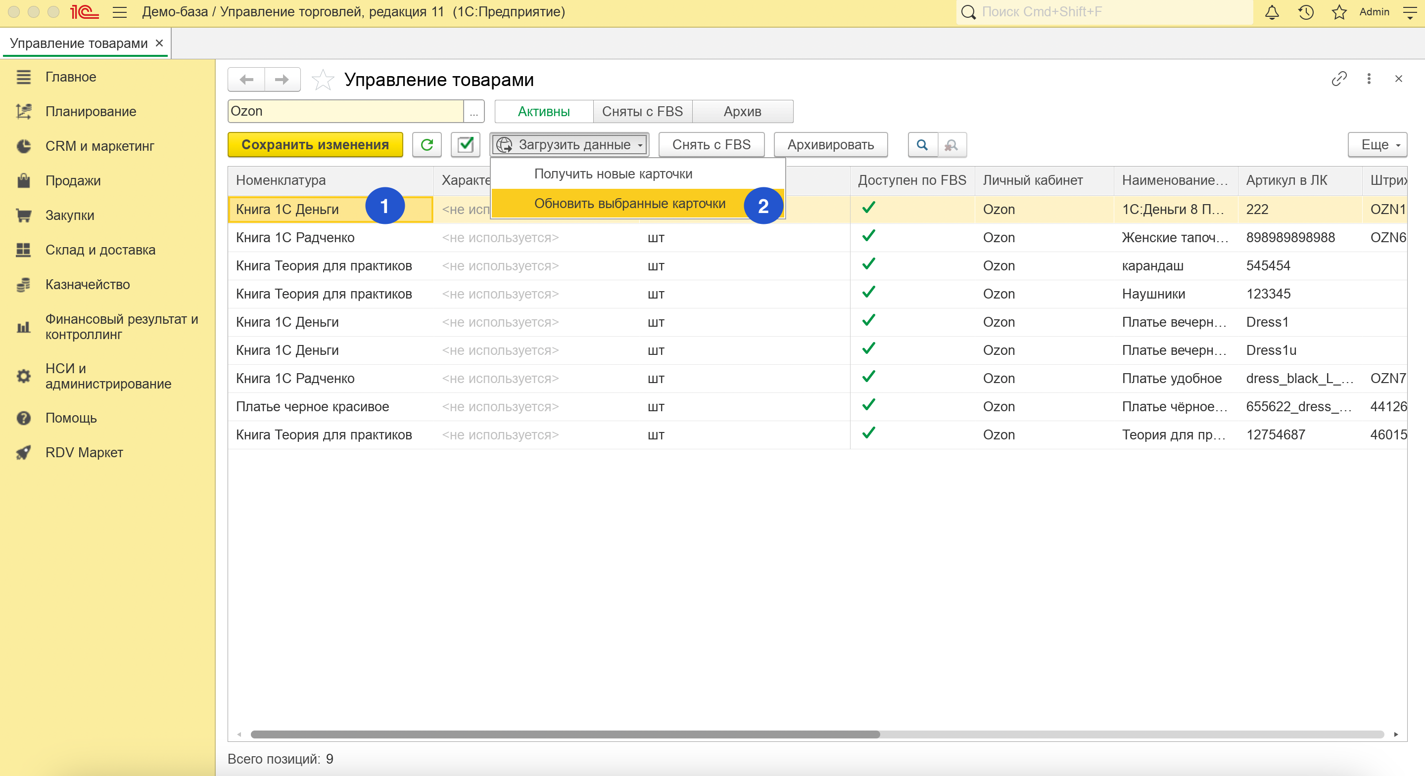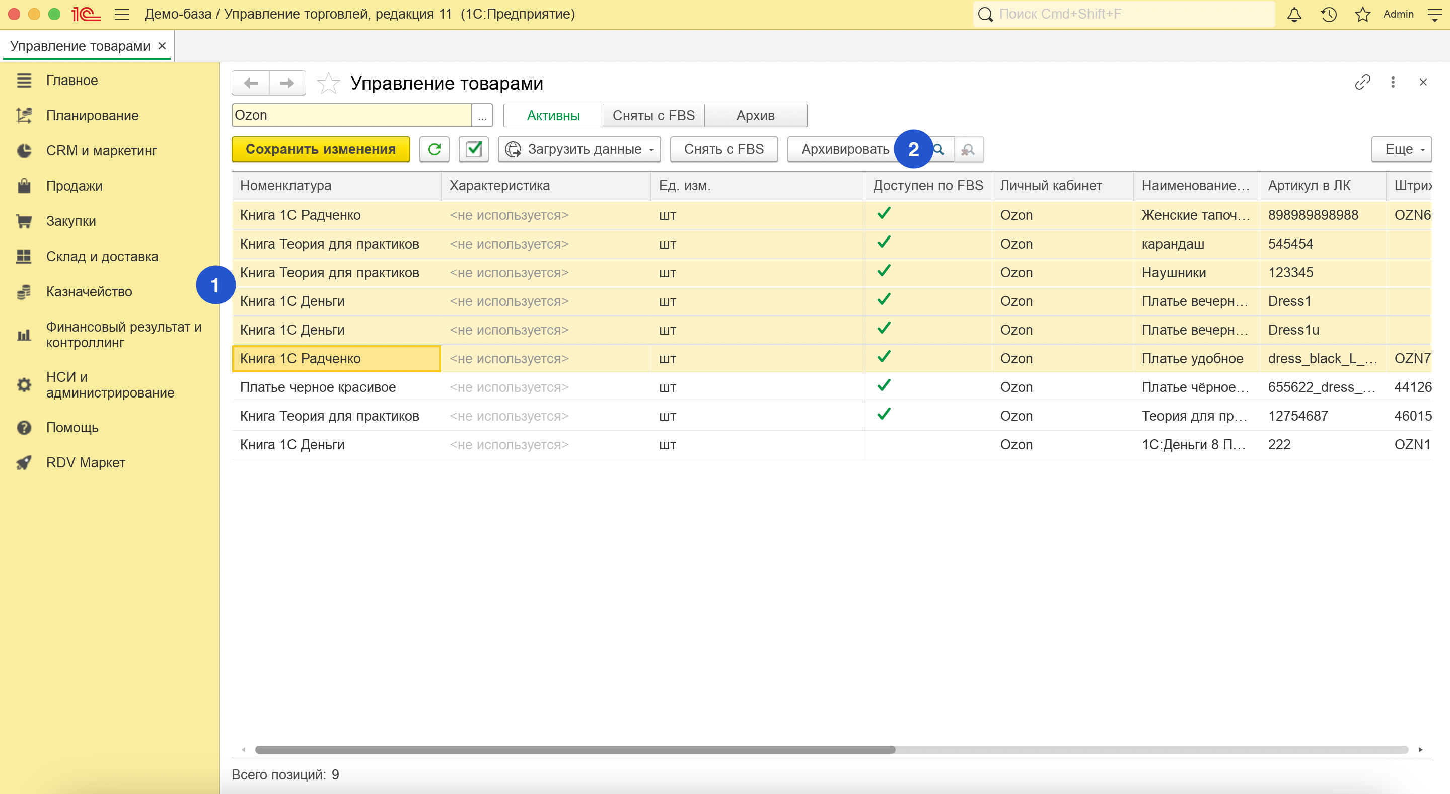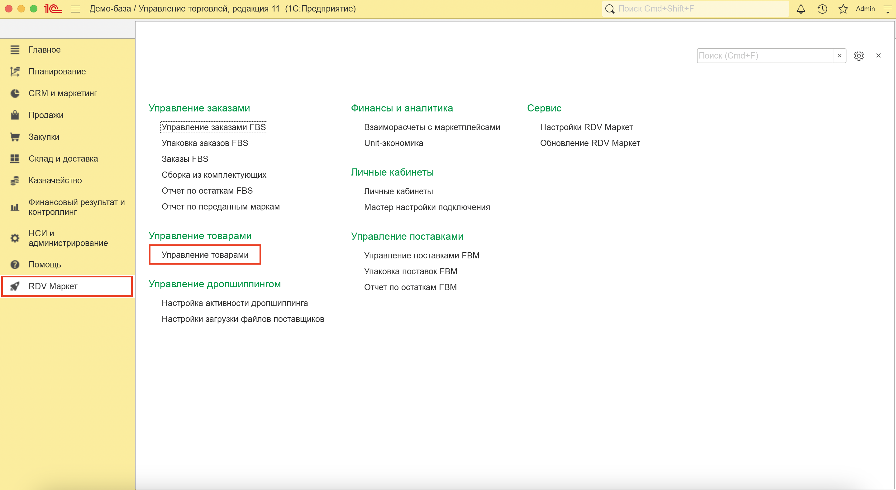 Работа с товарами осуществляется в разделе "RDV Маркет" - "Управление товарами":