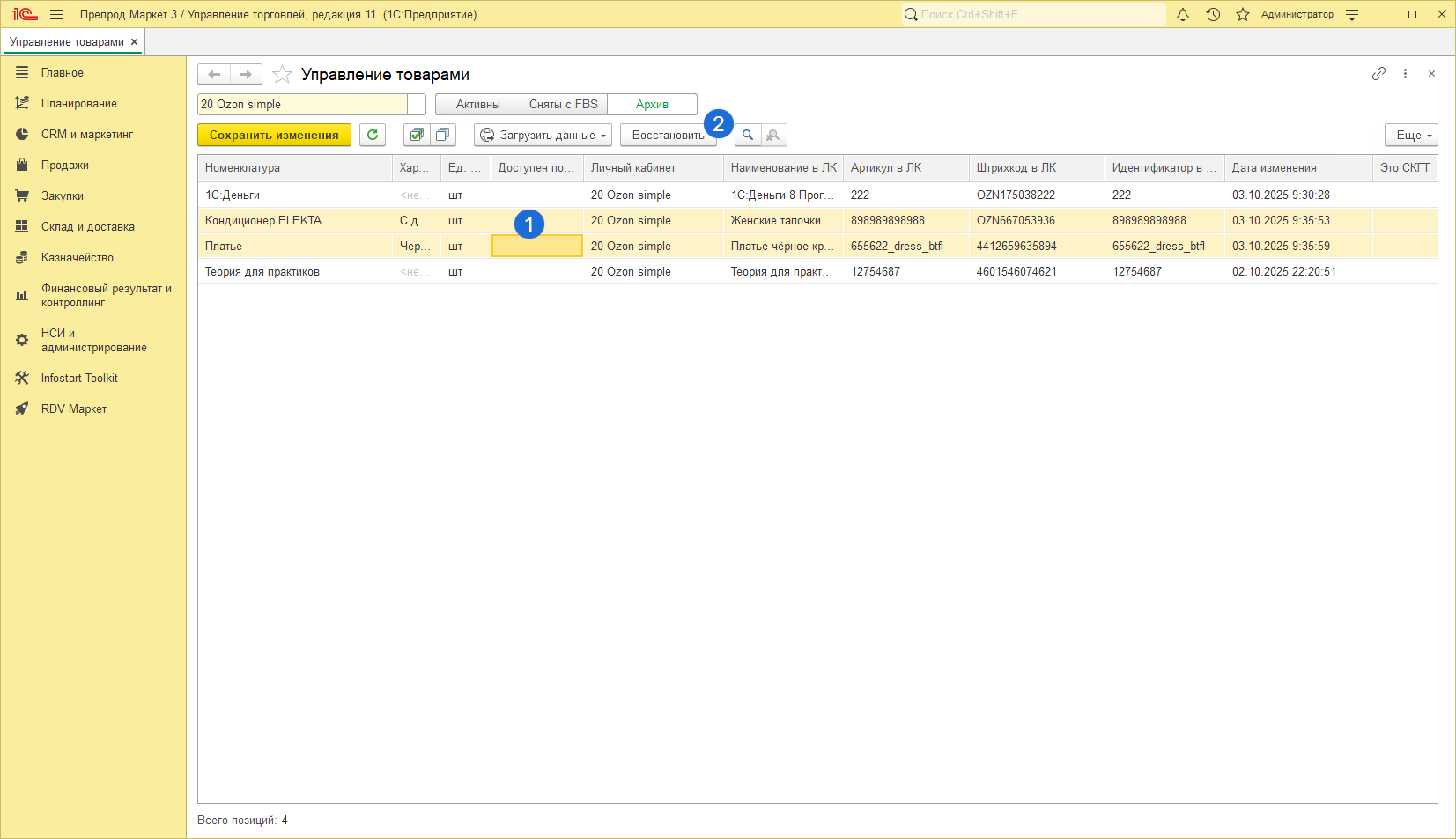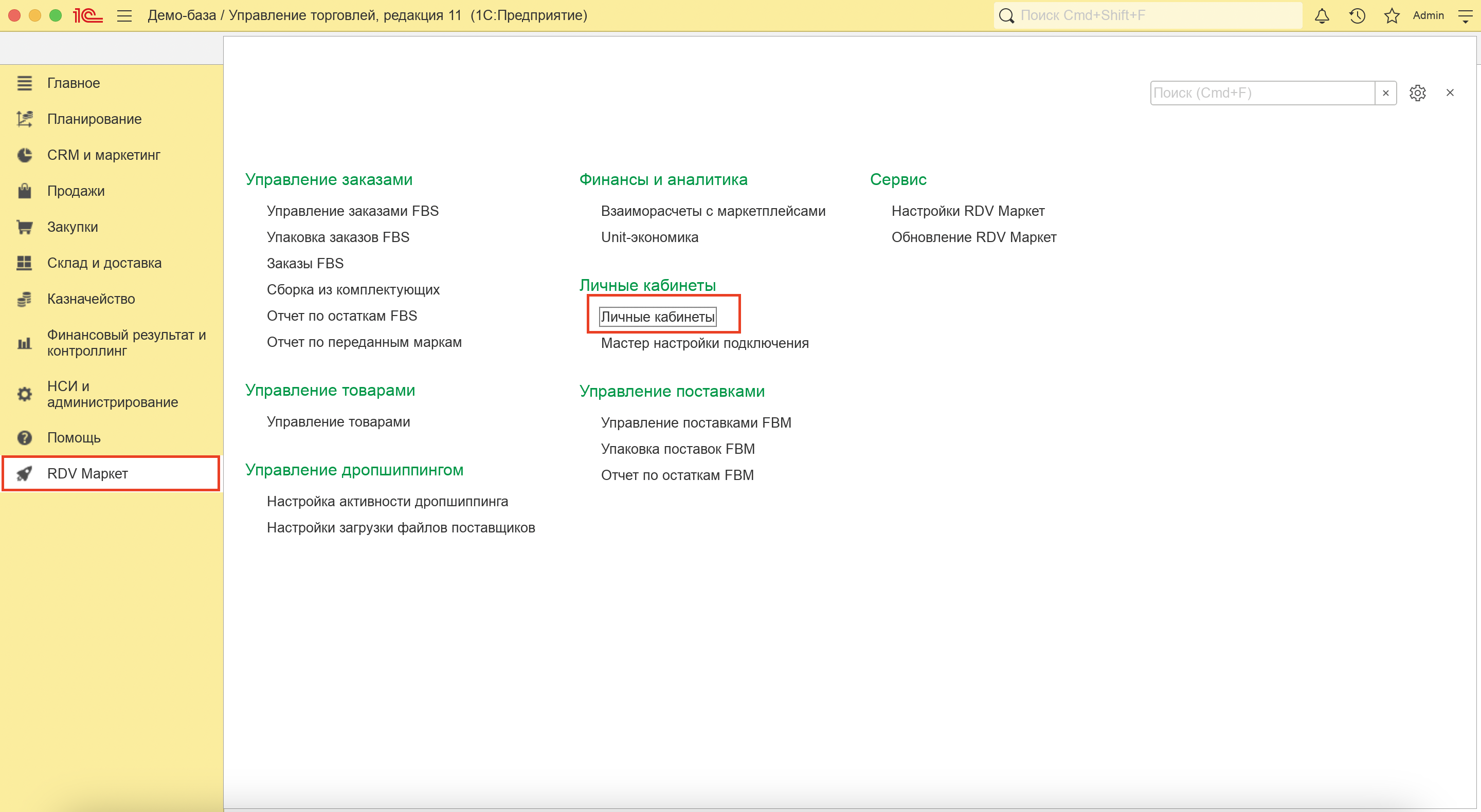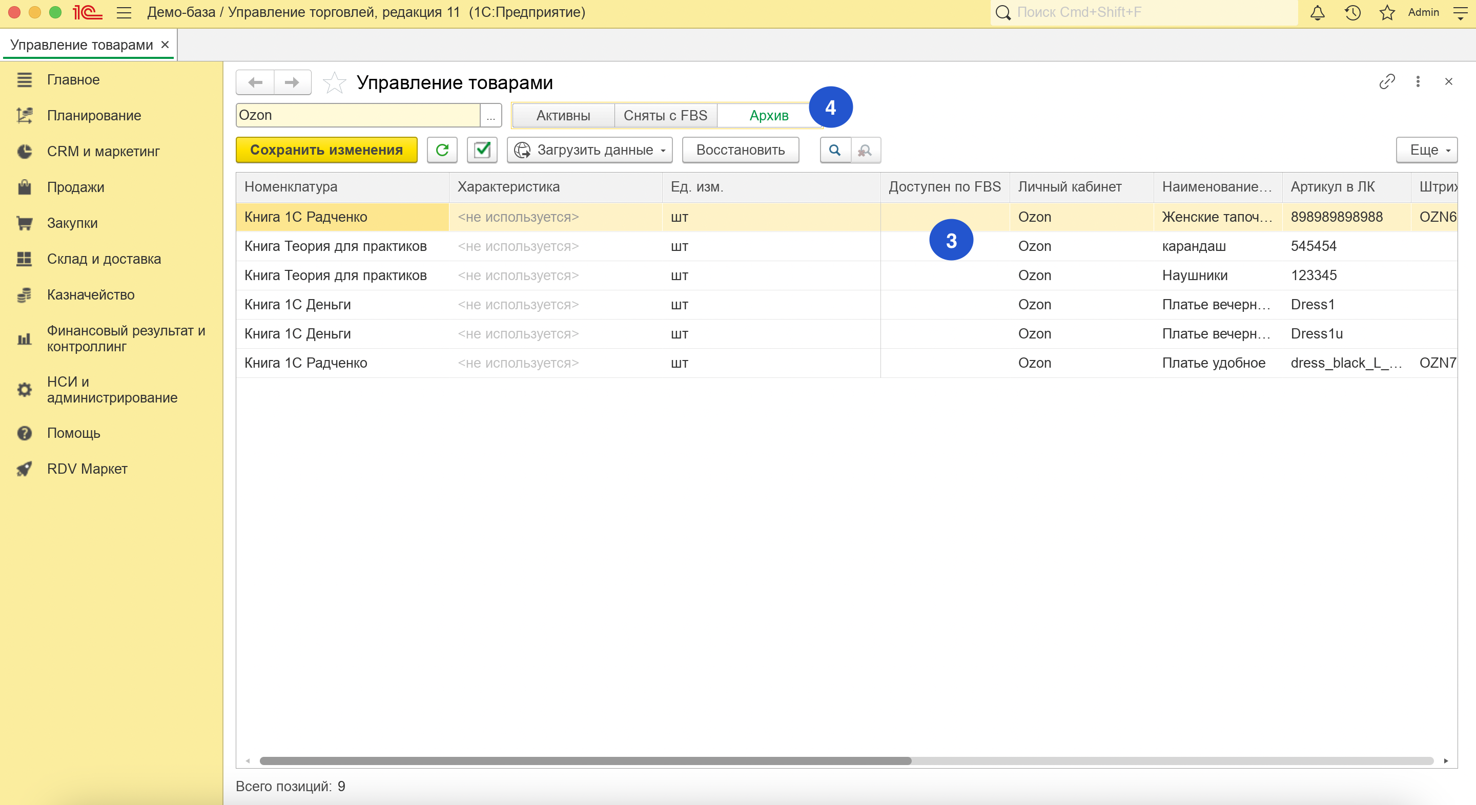 Работа с товарами осуществляется в разделе "RDV Маркет" - "Управление товарами":