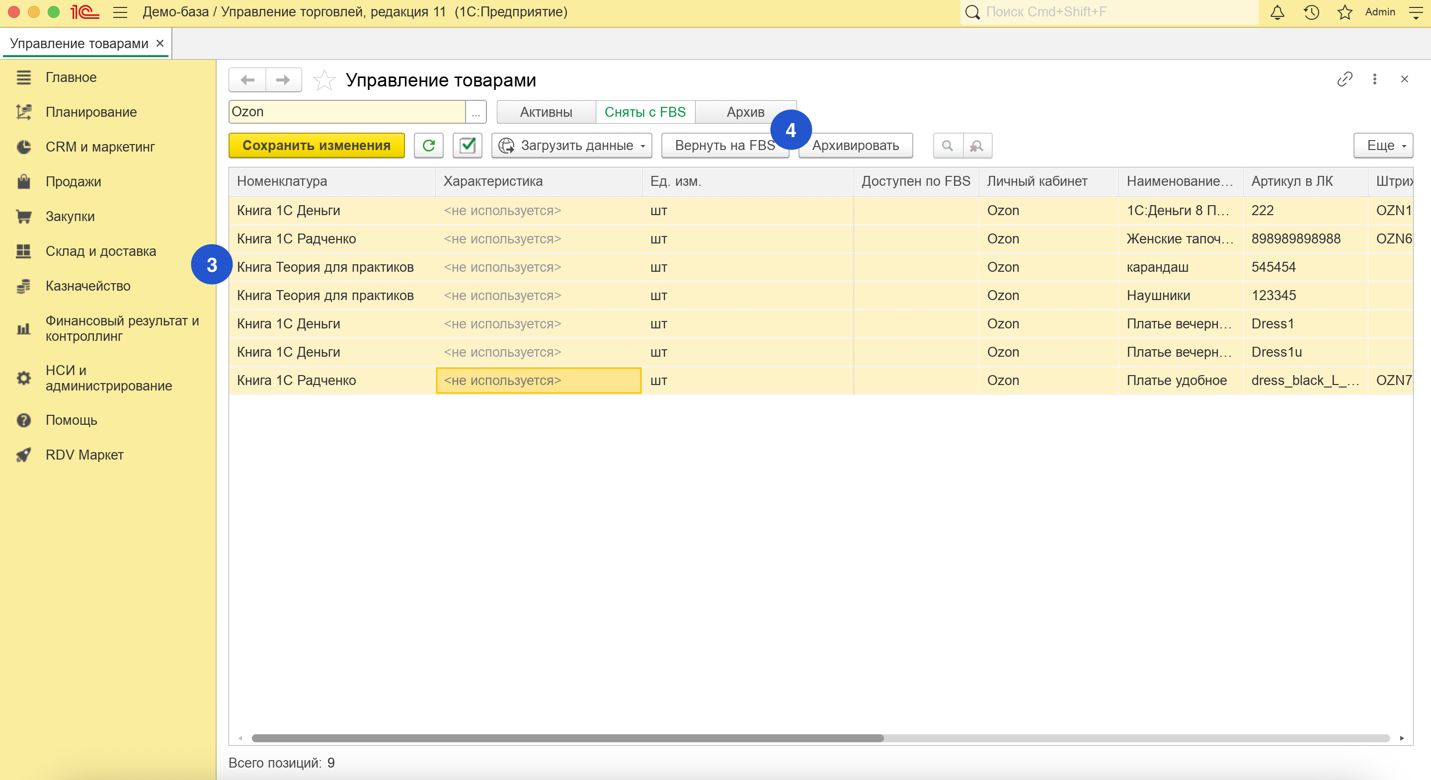 - Сняты с FBS - карточки, по которым отключена трансляция остатков FBS.