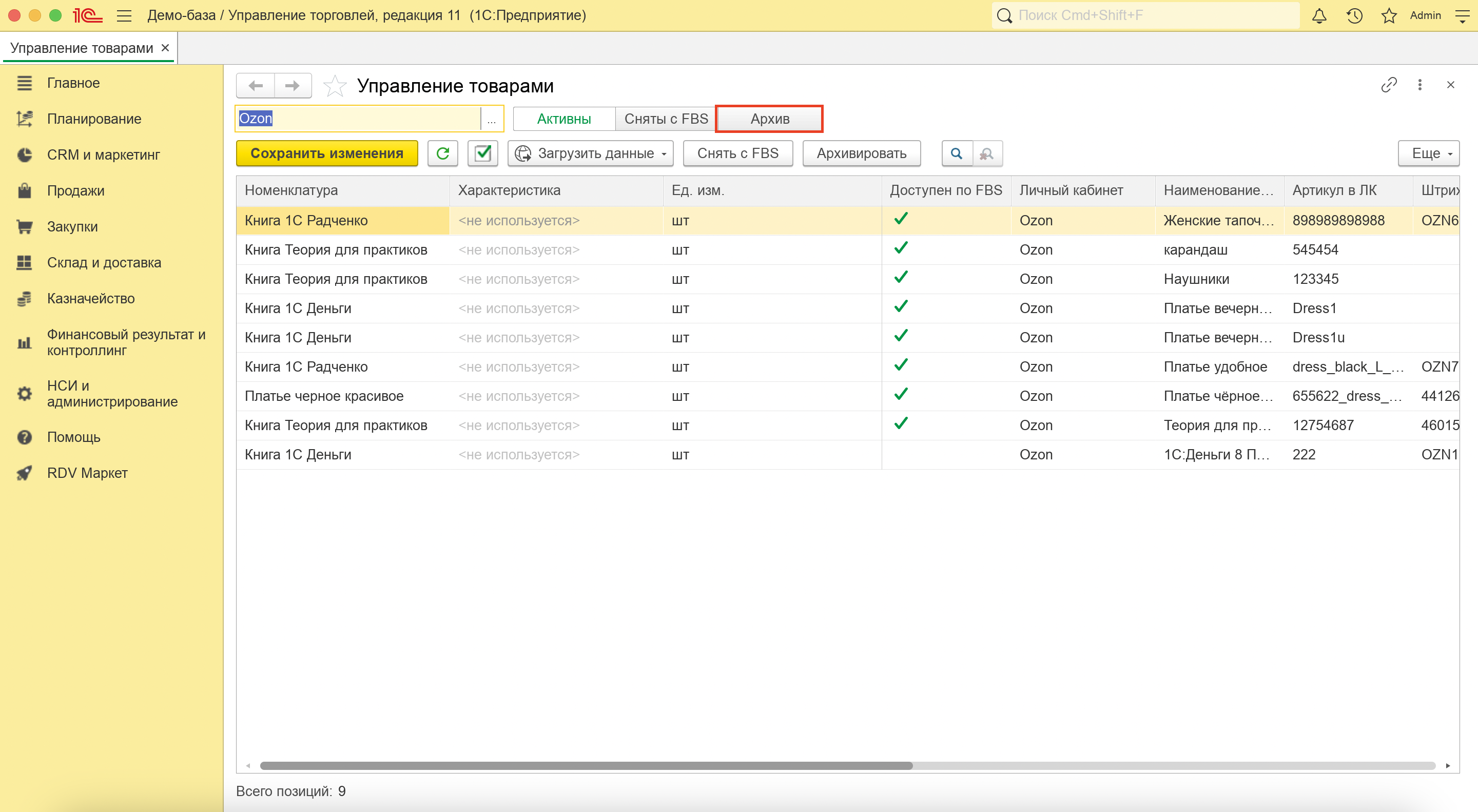 - Архив - карточки, снятые с продаж в личном кабинете.