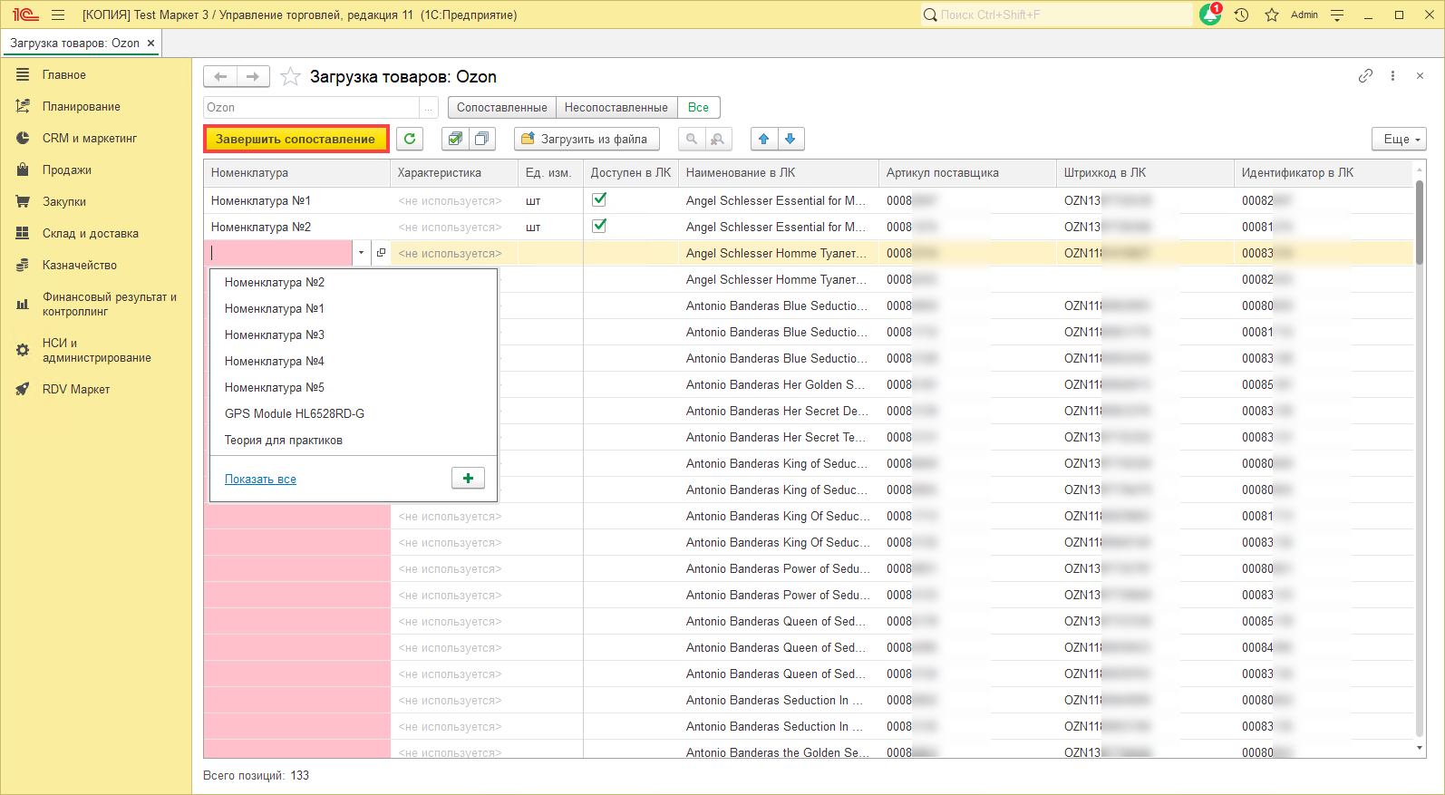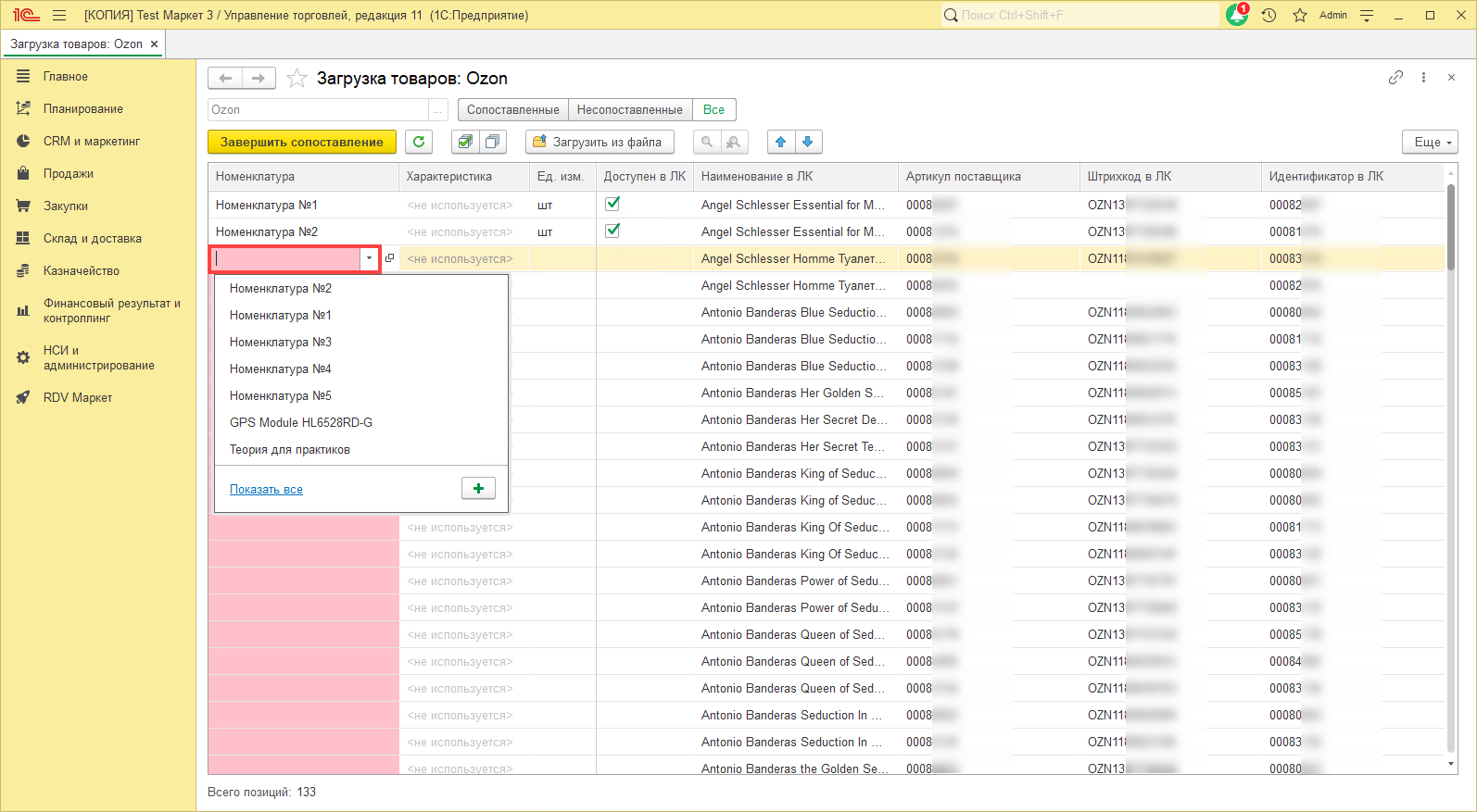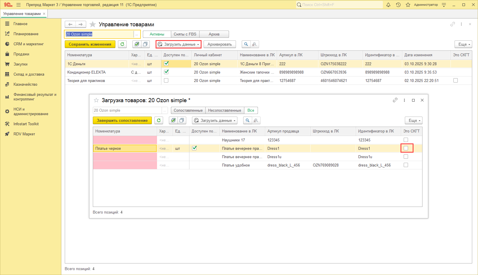 Товары МП сопоставляются с номенклатурой в 1С в соответствии с характеристиками и упаковками (если в базе ведётся учёт по данным признакам).