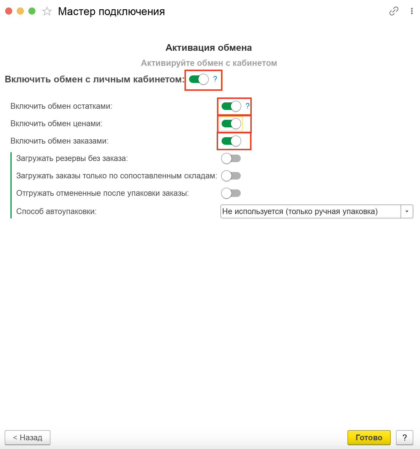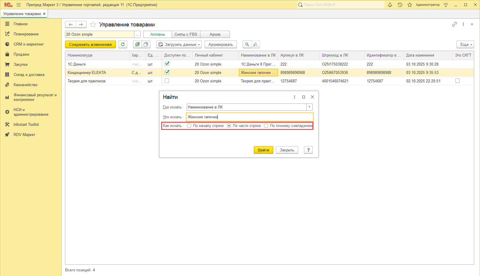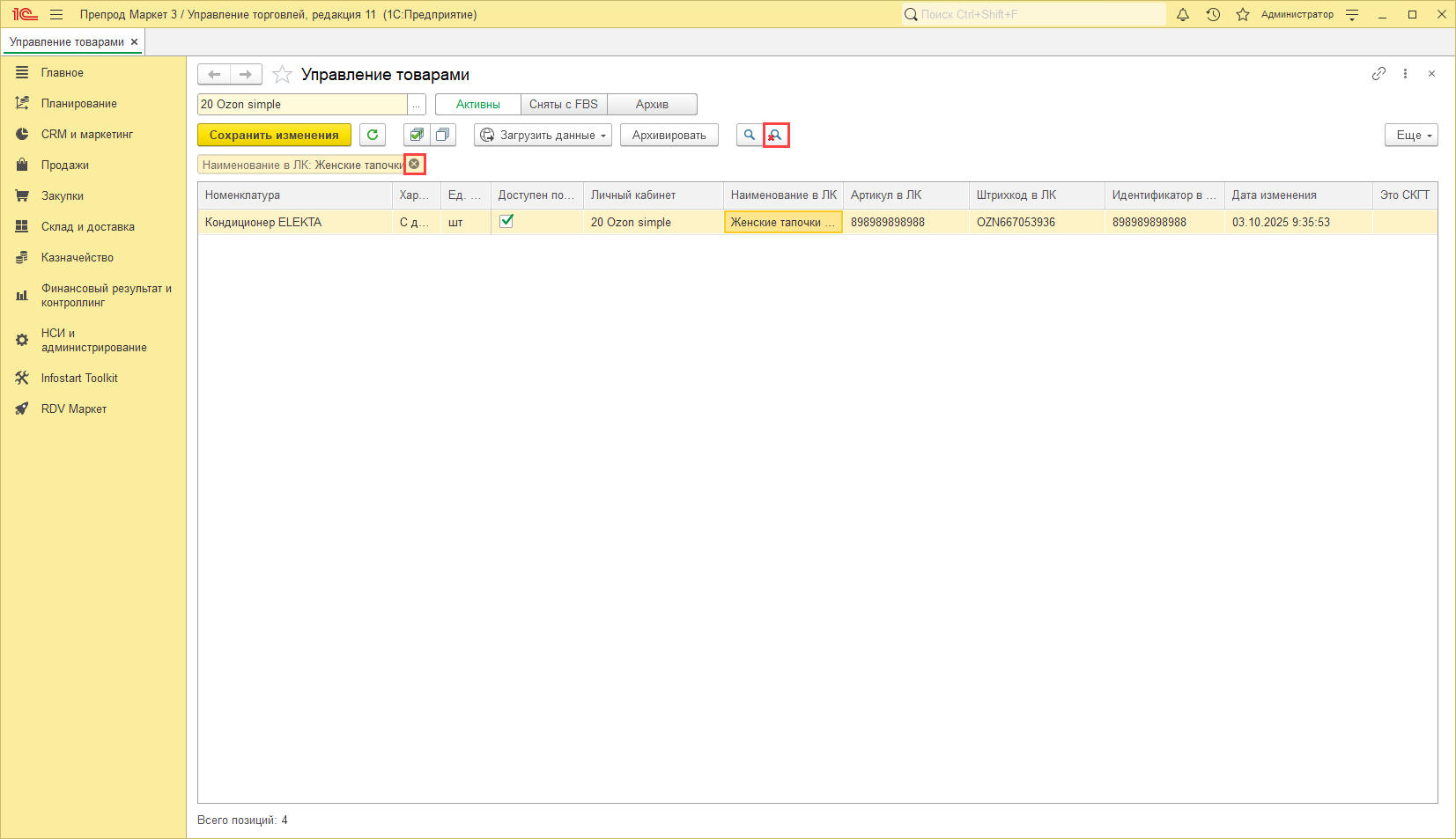 Товары МП сопоставляются с номенклатурой в 1С в соответствии с характеристиками и упаковками (если в базе ведётся учёт по данным признакам).