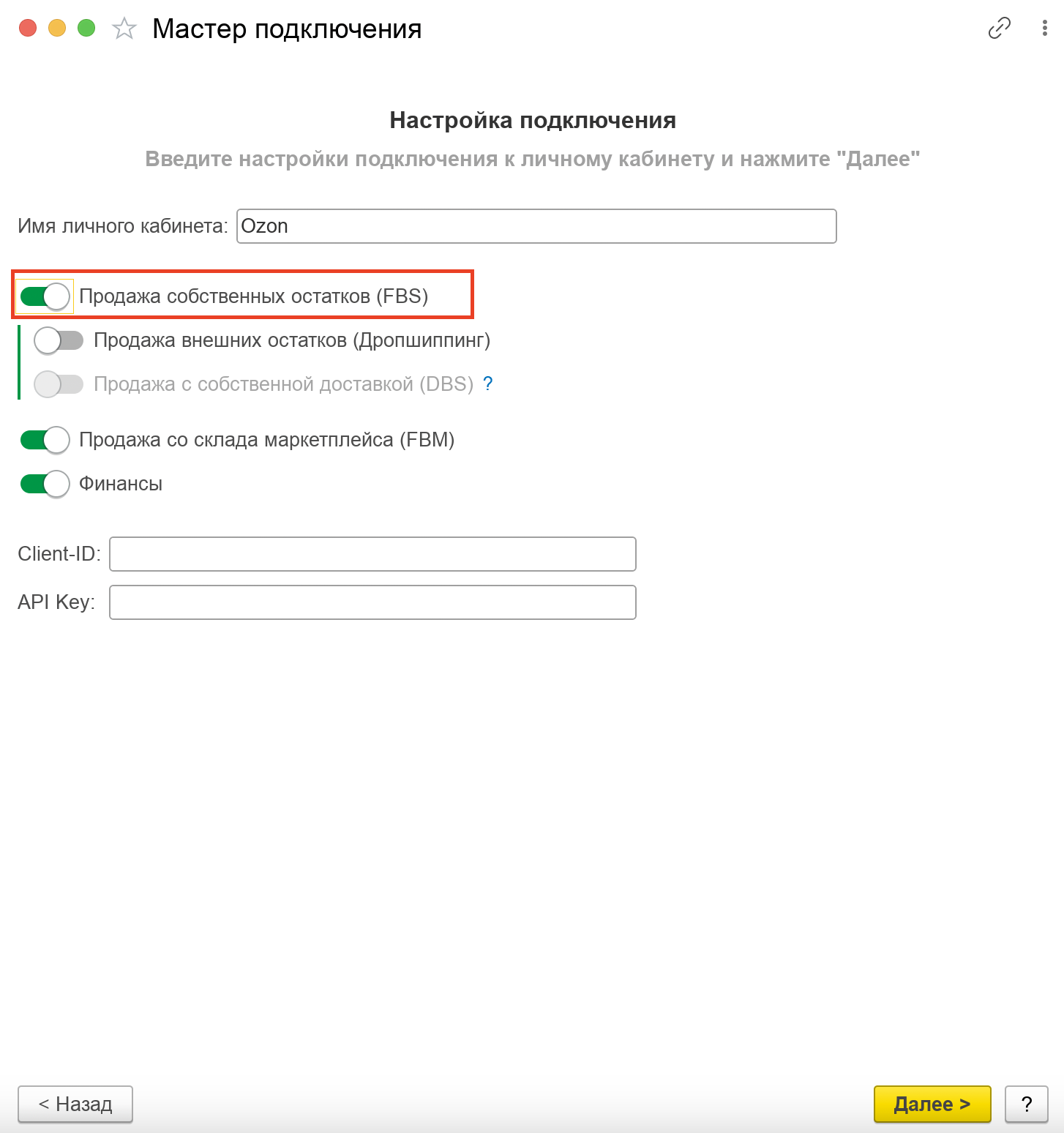 В форме "Управление товарами" есть признак "Доступен по FBS". Когда данный признак включён (установлен зелёный флаг), то по товару осуществляется передача информации о ценах и остатках на МП Ozon.