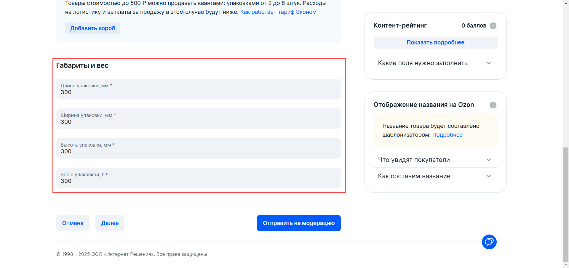 В ЛК Озон в карточке товара должны быть указанные соответствующие СКГТ товарам габариты и вес: