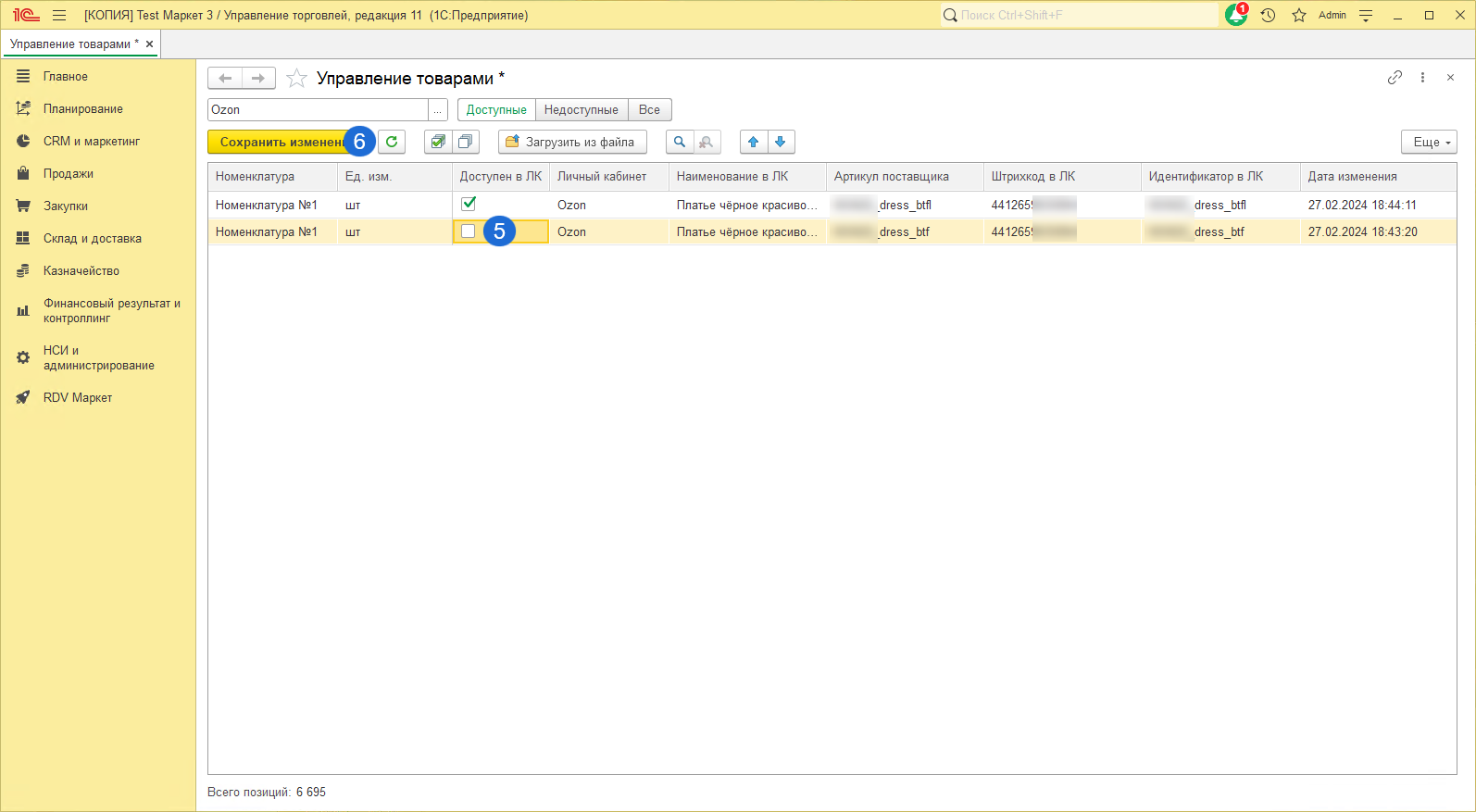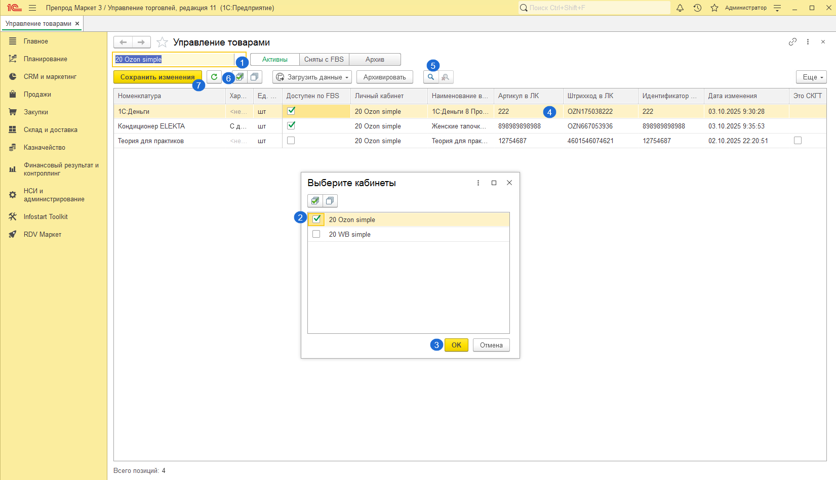 Снять доступность товара для отключения продажи в ЛК можно, если снять флаг "Доступен по FBS". Снять флаг можно как по конкретным товарам, так и по нескольким, воспользовавшись фильтрами из каждого столбца табличной формы (Номенклатура, ЛК, Артикул поставщика и т.д.).