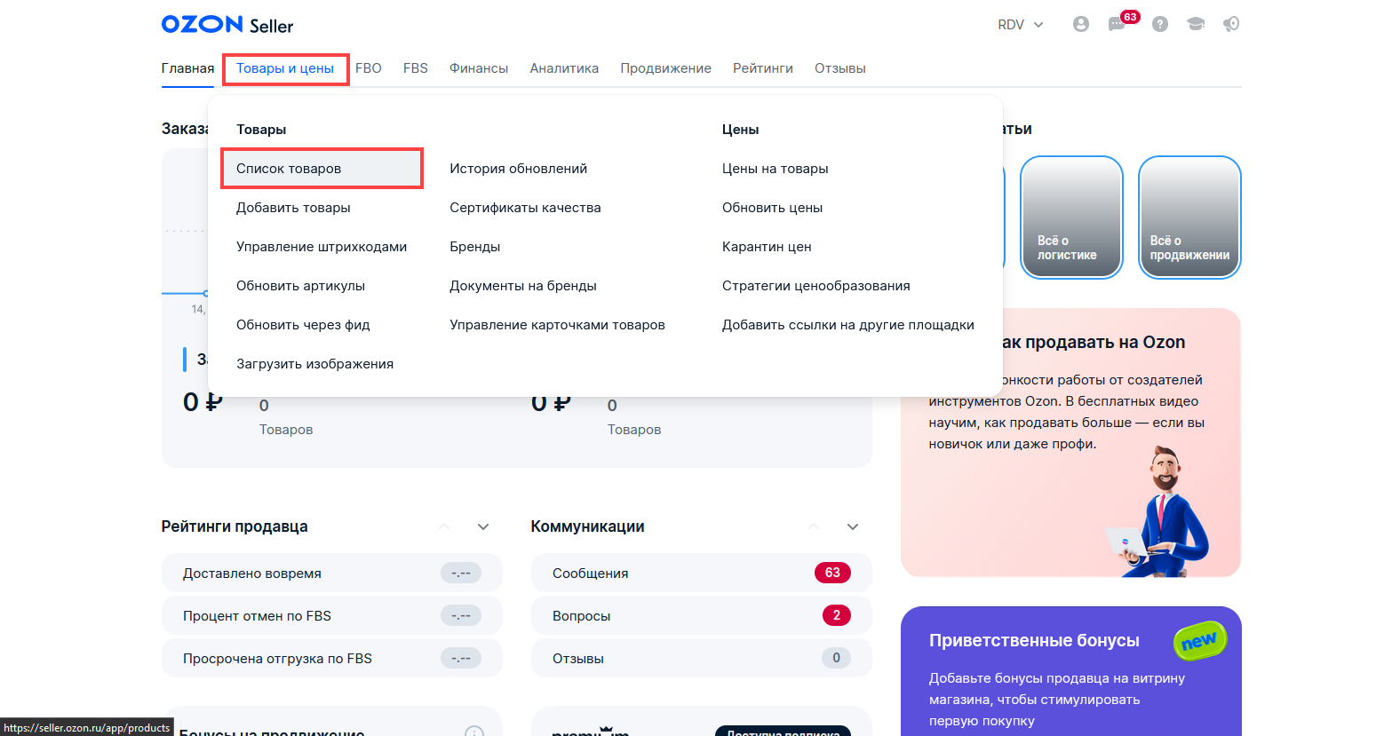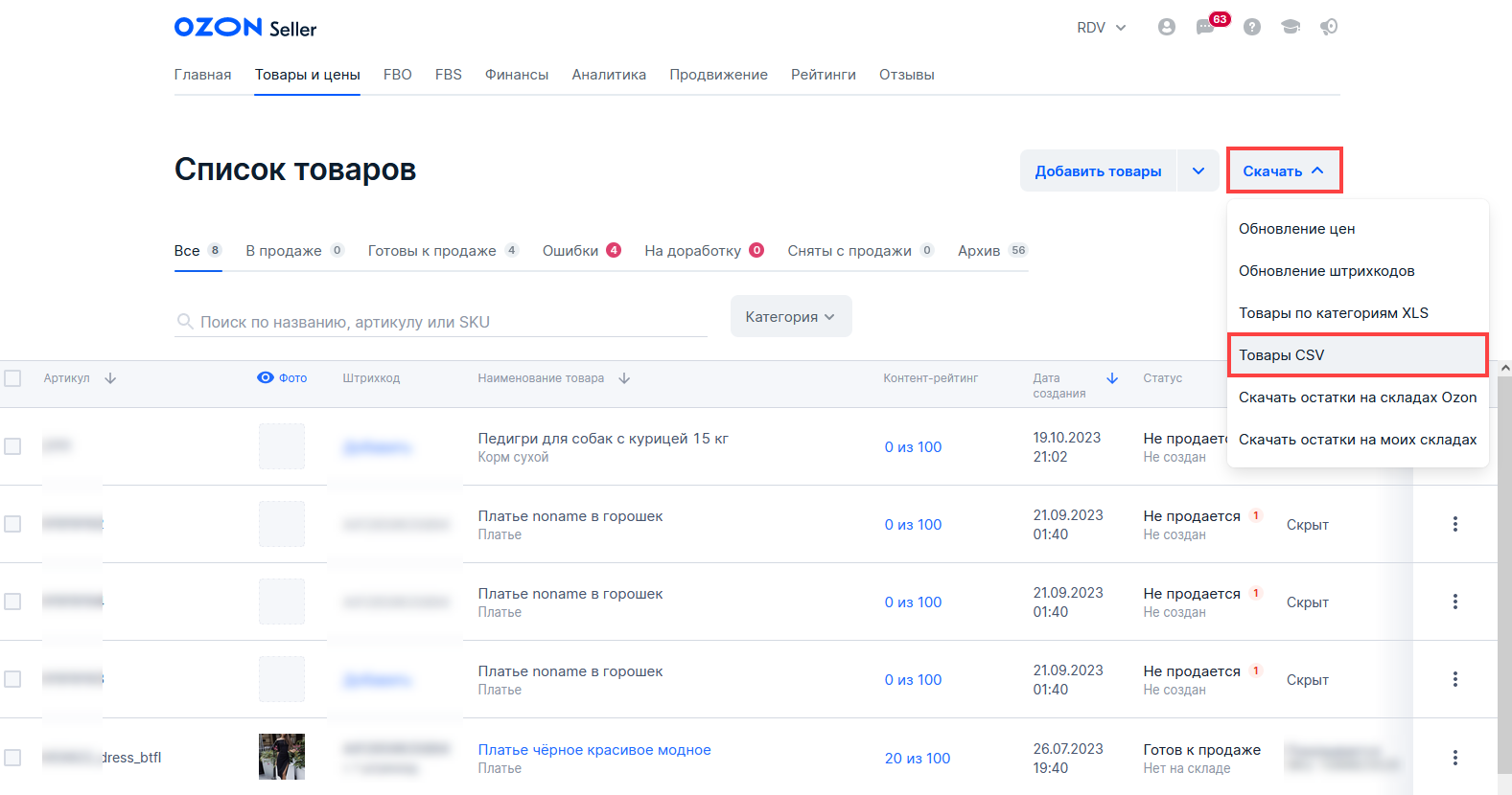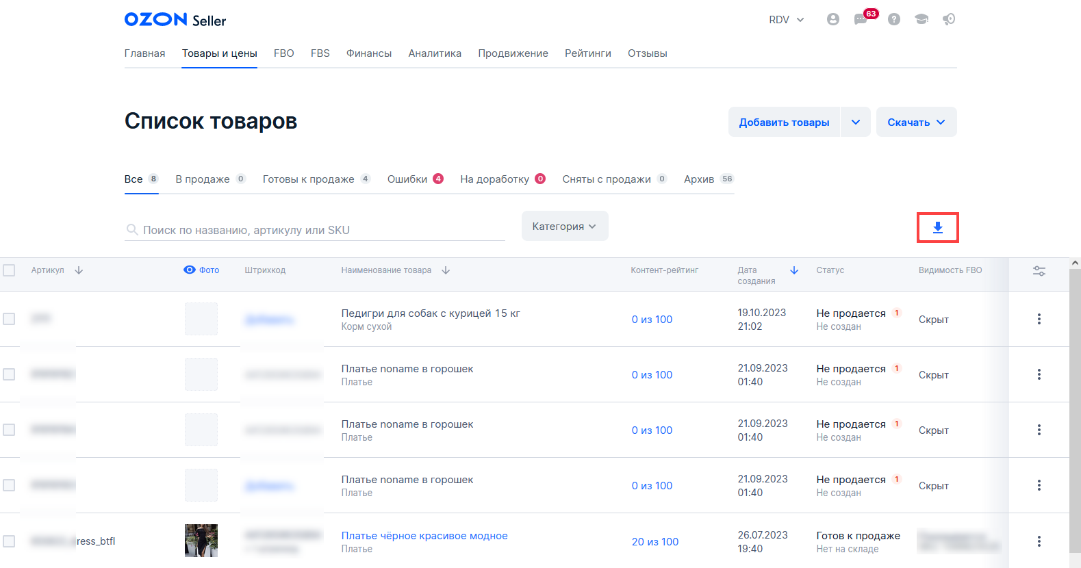 Скачайте файл с товарами из ЛК Озон. Для этого перейдите в личный кабинет, в раздел "Товары и цены" - "Список товаров":