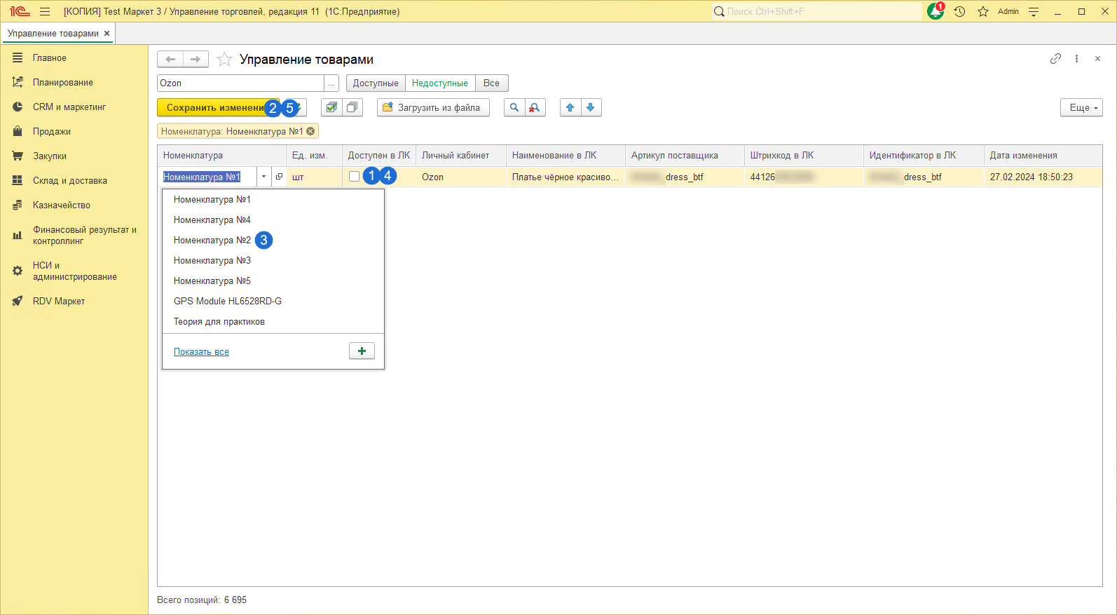 В случае, если номенклатура не сопоставилась автоматически, номенклатуру из 1С можно подставить вручную.